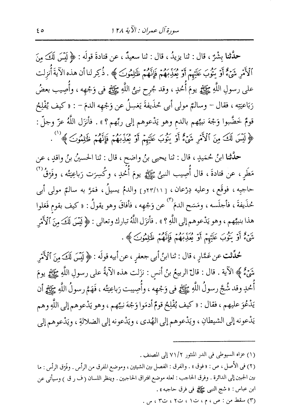 حَدَّثَنَا بِشْرٌ، قَالَ: ثنا يَزِيدُ، قَالَ: ثنا سَعِيدٌ، عَنْ قَتَادَةَ، قَوْلُهُ: {لَيْسَ لَكَ مِنَ الْأَمْرِ شَيْءٌ أَوْ يَتُوبَ عَلَيْهِمْ أَوْ يُعَذِّبَهُمْ فَإِنَّهُمْ ظَالِمُونَ} [آل عمران: 128] " ذُكِرَ لَنَا أَنَّ هَذِهِ الْآيَةَ أُنْزِلَتْ عَلَى رَسُولِ اللَّهِ صَلَّى اللهُ عَلَيْهِ وَسَلَّمَ يَوْمَ أُحُدٍ، وَقَدْ جُرِحَ نَبِيُّ اللَّهِ صَلَّى اللهُ عَلَيْهِ وَسَلَّمَ فِي وَجْهِهِ، وَأُصِيبَ بَعْضُ رَبَاعِيَّتِهِ، فَقَالَ وَسَالِمٌ مَوْلَى أَبِي حُذَيْفَةَ يَغْسِلُ عَنْ وَجْهِهِ الدَّمَ: «§كَيْفَ يُفْلِحُ قَوْمٌ خَضَّبُوا وَجْهَ نَبِيِّهِمْ بِالدَّمِ وَهُوَ يَدْعُوهُمْ إِلَى رَبِّهِمْ؟» فَأَنْزَلَ اللَّهُ عَزَّ وَجَلَّ: {لَيْسَ لَكَ مِنَ الْأَمْرِ شَيْءٌ أَوْ يَتُوبَ عَلَيْهِمْ أَوْ يُعَذِّبَهُمْ فَإِنَّهُمْ ظَالِمُونَ} [آل عمران: 128]