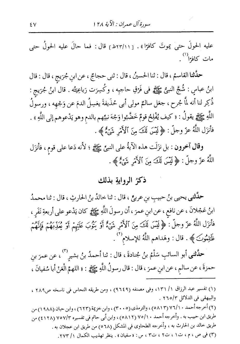 ذِكْرُ الرِّوَايَةِ بِذَلِكَ: حَدَّثَنِي يَحْيَى بْنُ حَبِيبِ بْنِ عَرَبِيٍّ، قَالَ: ثنا خَالِدُ بْنُ الْحَارِثِ، قَالَ: ثنا مُحَمَّدُ بْنُ عَجْلَانَ، عَنْ نَافِعٍ، عَنِ ابْنِ عُمَرَ، أَنَّ رَسُولَ اللَّهِ صَلَّى اللهُ عَلَيْهِ وَسَلَّمَ، كَانَ يَدْعُو عَلَى أَرْبَعَةٍ نَفَرٍ، فَأَنْزَلَ اللَّهُ عَزَّ وَجَلَّ: {§لَيْسَ لَكَ مِنَ الْأَمْرِ شَيْءٌ أَوْ يَتُوبَ عَلَيْهِمْ أَوْ يُعَذِّبَهُمْ فَإِنَّهُمْ ظَالِمُونَ} [آل عمران: 128] قَالَ: «وَهَدَاهُمُ اللَّهُ لِلْإِسْلَامِ»