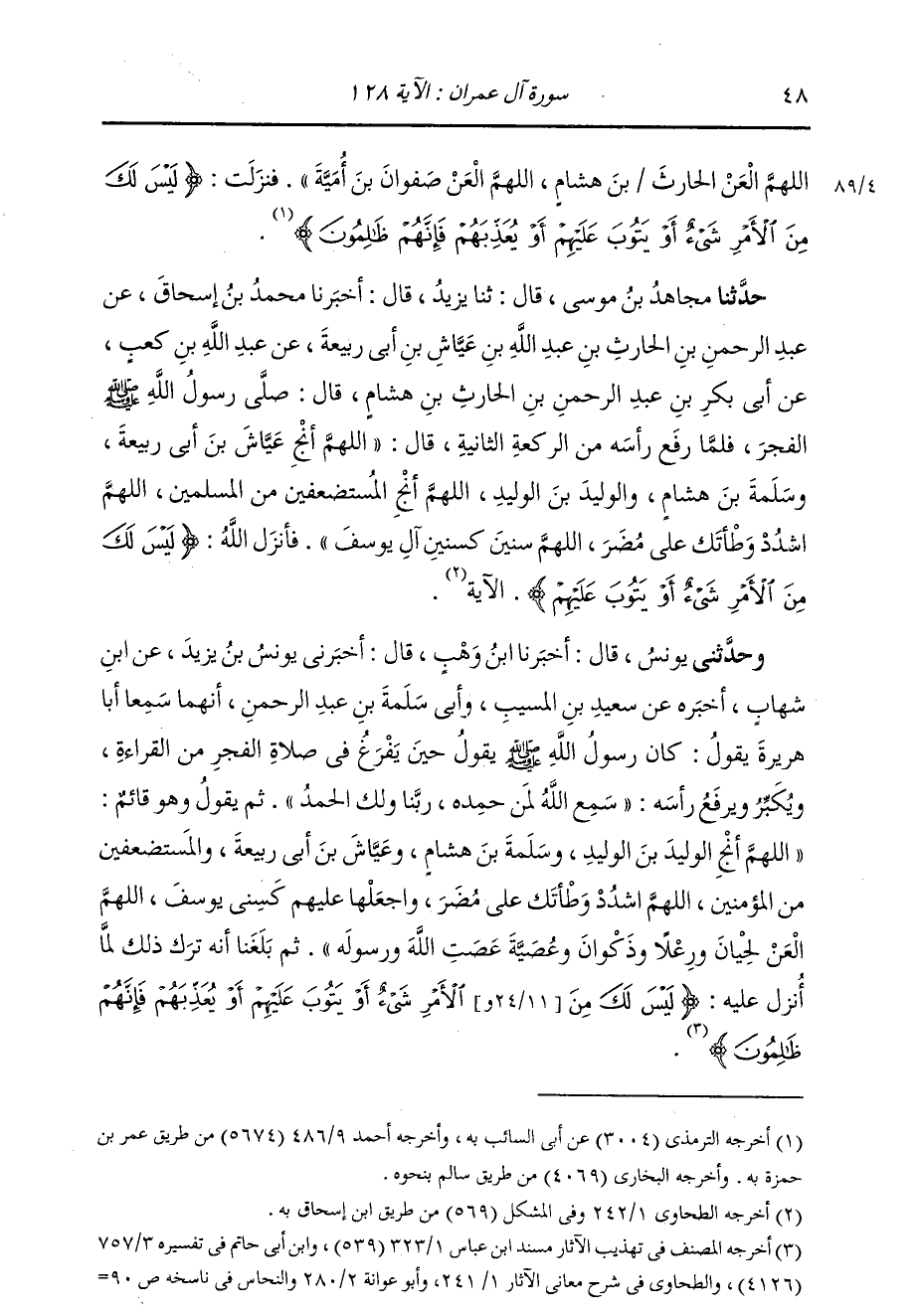 حَدَّثَنَا مُجَاهِدُ بْنُ مُوسَى، قَالَ: ثنا يَزِيدُ، قَالَ: أَخْبَرَنَا مُحَمَّدُ بْنُ إِسْحَاقَ، عَنْ عَبْدِ الرَّحْمَنِ بْنِ الْحَارِثِ بْنِ عَبْدِ اللَّهِ بْنِ عَيَّاشِ بْنِ أَبِي رَبِيعَةَ، عَنْ عَبْدِ اللَّهِ بْنِ كَعْبٍ، عَنْ أَبِي بَكْرِ بْنِ عَبْدِ الرَّحْمَنِ بْنِ الْحَارِثِ بْنِ هِشَامٍ، قَالَ: صَلَّى رَسُولُ اللَّهِ صَلَّى اللهُ عَلَيْهِ وَسَلَّمَ الْفَجْرَ، فَلَمَّا رَفَعَ رَأْسَهُ مِنَ الرَّكْعَةِ الثَّانِيَةِ، قَالَ: «§اللَّهُمَّ أَنْجِ عَيَّاشَ بْنَ أَبِي رَبِيعَةَ وَسَلَمَةَ بْنَ هِشَامٍ وَالْوَلِيدَ بْنَ الْوَلِيدِ، اللَّهُمَّ أَنْجِ الْمُسْتَضْعَفِينَ مِنَ الْمُسْلِمِينَ، اللَّهُمَّ اشْدُدْ وَطْأَتَكَ عَلَى مُضَرَ، اللَّهُمَّ سِنِينَ كَسِنِينَ آلِ يُوسُفَ» فَأَنْزَلَ اللَّهُ: {لَيْسَ لَكَ مِنَ الْأَمْرِ شَيْءٌ أَوْ يَتُوبَ عَلَيْهِمْ} [آل عمران: 128] الْآيَةَ