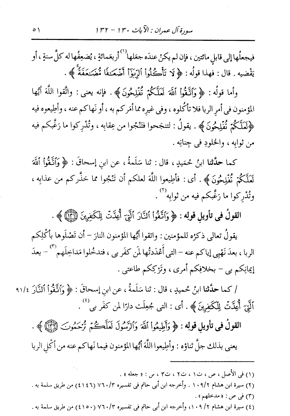 فَيَجْعَلُهَا إِلَى قَابِلٍ مِائَتَيْنِ، فَإِنْ لَمْ يَكُنْ عِنْدَهُ جَعَلَهَا أَرْبَعَمِائَةٍ، يُضْعِفُهَا لَهُ كُلَّ سَنَةٍ، أَوْ يَقْضِيهِ، قَالَ: فَهَذَا قَوْلُهُ: {لَا تَأْكُلُوا الرِّبَا أَضْعَافًا مُضَاعَفَةً} [آل عمران: 130] " وَأَمَّا قَوْلُهُ: {وَاتَّقُوا اللَّهَ لَعَلَّكُمْ تُفْلِحُونَ} [البقرة: 189] فَإِنَّهُ يَعْنِي: وَاتَّقُوا اللَّهَ أَيُّهَا الْمُؤْمِنُونَ فِي أَمْرِ الرِّبَا فَلَا تَأْكُلُوهُ، وَفِي غَيْرِهِ مِمَّا أَمَرَكُمْ بِهِ، أَوْ نَهَاكُمْ عَنْهُ، وَأَطِيعُوهُ فِيهِ لَعَلَّكُمْ تُفْلِحُونَ، يَقُولُ: لِتَنْجَحُوا فَتَنْجُوا مِنْ عِقَابِهِ، وَتُدْرِكُوا مَا رَغَّبَكُمْ فِيهِ مِنْ ثَوَابِهِ، وَالْخُلُودِ فِي جِنَانِهِ