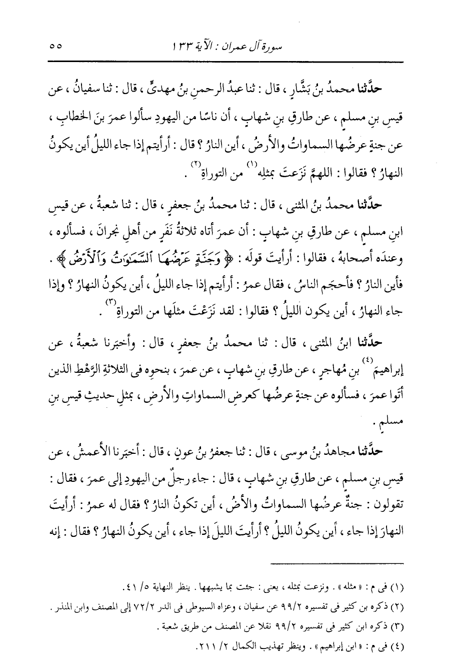 حَدَّثَنِي مُحَمَّدُ بْنُ الْمُثَنَّى، قَالَ: ثنا مُحَمَّدُ بْنُ جَعْفَرٍ، قَالَ: ثنا شُعْبَةُ، عَنْ قَيْسِ بْنِ مُسْلِمٍ، عَنْ طَارِقِ بْنِ شِهَابٍ أَنَّ عُمَرَ أَتَاهُ ثَلَاثَةُ نَفَرٍ مِنْ أَهْلِ نَجْرَانَ، فَسَأَلُوهُ وَعِنْدَهُ أَصْحَابُهُ، فَقَالُوا: أَرَأَيْتَ قَوْلَهُ: {§وَجَنَّةٍ عَرْضُهَا السَّمَوَاتُ وَالْأَرْضُ} فَأَيْنَ النَّارُ؟ فَأَحْجَمَ النَّاسُ، فَقَالَ عُمَرُ: «أَرَأَيْتُمْ إِذَا جَاءَ اللَّيْلُ، أَيْنَ يَكُونُ النَّهَارُ؟ وَإِذَا جَاءَ النَّهَارُ أَيْنَ يَكُونُ اللَّيْلُ؟» فَقَالُوا: نَزَعْتَ مَثَلَهَا مِنَ التَّوْرَاةِ " حَدَّثَنَا ابْنُ الْمُثَنَّى، قَالَ: ثنا مُحَمَّدُ بْنُ جَعْفَرٍ، قَالَ: أَخْبَرَنَا شُعْبَةُ، عَنْ إِبْرَاهِيمَ بْنِ مُهَاجِرٍ، عَنْ طَارِقِ بْنِ شِهَابٍ، عَنْ عُمَرَ، بِنَحْوِهِ فِي الثَّلَاثَةِ الرَّهْطِ الَّذِينَ أَتَوْا عُمَرَ، فَسَأَلُوهُ عَنْ جَنَّةٍ عَرْضُهَا كَعَرْضِ السَّمَاوَاتِ وَالْأَرْضِ، بِمِثْلِ حَدِيثِ قَيْسِ بْنِ مُسْلِمٍ
