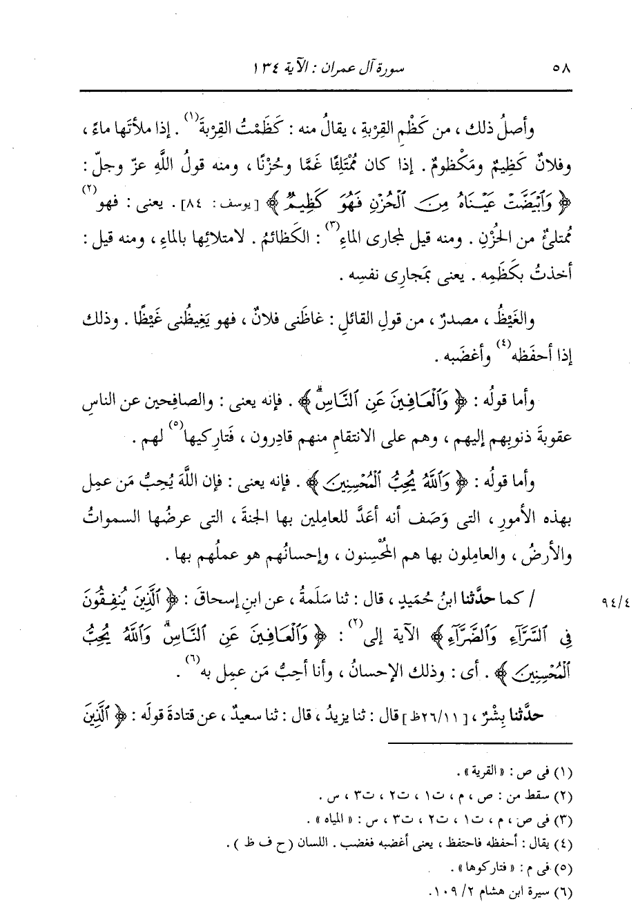 حَدَّثَنَا بِشْرٌ، قَالَ: ثنا يَزِيدُ، قَالَ: ثنا سَعِيدٌ، عَنْ قَتَادَةَ، قَوْلُهُ: {§الَّذِينَ -[59]- يُنْفِقُونَ فِي السَّرَّاءِ وَالضَّرَّاءِ وَالْكَاظِمِينَ الْغَيْظَ وَالْعَافِينَ عَنِ النَّاسِ وَاللَّهُ يُحِبُّ الْمُحْسِنِينَ} [آل عمران: 134] «قَوْمٌ أَنْفَقُوا فِي الْعُسْرِ وَالْيُسْرِ، وَالْجَهْدِ وَالرَّخَاءِ، فَمَنِ اسْتَطَاعَ أَنْ يَغْلِبَ الشَّرَّ بِالْخَيْرِ فَلْيَفْعَلْ، وَلَا قُوَّةَ إِلَّا بِاللَّهِ، فَنِعْمَتْ وَاللَّهِ يَا ابْنَ آدَمَ الْجَرَعَةُ تَجْتَرِعُهَا مِنْ صَبْرٍ وَأَنْتَ مَغِيظٌ وَأَنْتَ مَظْلُومٌ»