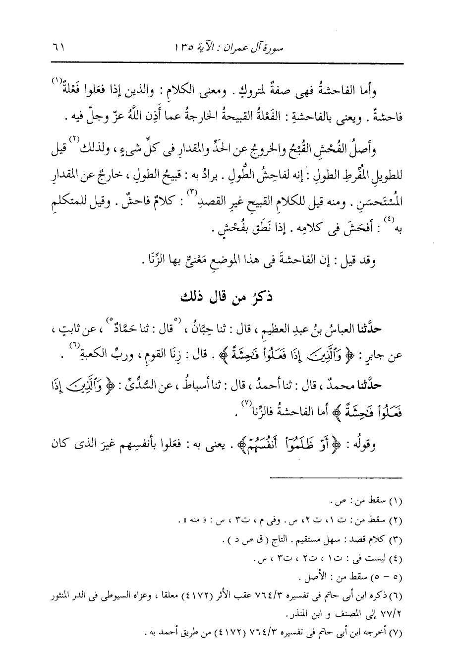 ذِكْرُ مَنْ قَالَ ذَلِكَ: حَدَّثَنَا الْعَبَّاسُ بْنُ عَبْدِ الْعَظِيمِ، قَالَ: ثنا حِبَّانُ، قَالَ: ثنا حَمَّادٌ، عَنْ ثَابِتٍ، عَنْ جَابِرٍ: {§وَالَّذِينَ إِذَا فَعَلُوا فَاحِشَةً} [آل عمران: 135] قَالَ: «زَنَى الْقَوْمُ وَرَبِّ الْكَعْبَةِ»