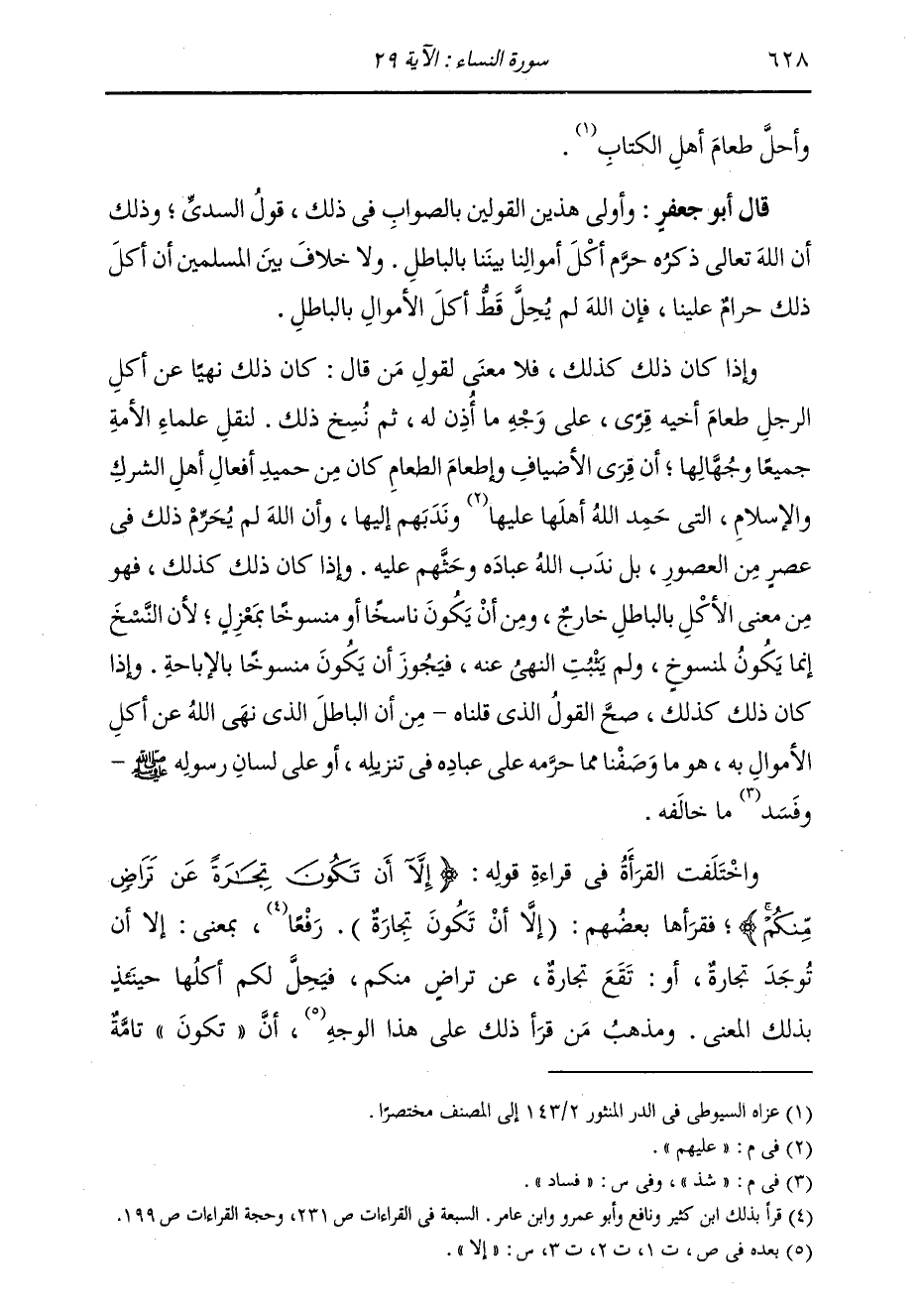وَأَحَلَّ طَعَامَ أَهْلِ الْكِتَابِ " قَالَ أَبُو جَعْفَرٍ: وَأَوْلَى هَذَيْنِ الْقَوْلَيْنِ بِالصَّوَابِ فِي ذَلِكَ قَوْلُ السُّدِّيِّ: وَذَلِكَ أَنَّ اللَّهَ تَعَالَى ذِكْرُهُ حَرَّمَ أَكْلَ أَمْوَالِنَا بَيْنَنَا بِالْبَاطِلِ , وَلَا خِلَافَ بَيْنَ الْمُسْلِمِينَ أَنَّ أَكْلَ ذَلِكَ حَرَامٌ عَلَيْنَا , فَإِنَّ اللَّهَ لَمْ يَحِلَّ قَطُّ أَكْلَ الْأَمْوَالِ بِالْبَاطِلِ , وَإِذَا كَانَ ذَلِكَ كَذَلِكَ فَلَا مَعْنَى لِقَوْلِ مَنْ قَالَ: كَانَ ذَلِكَ نَهْيًا عَنْ أَكْلِ الرَّجُلِ طَعَامَ أَخِيهِ قِرًى عَلَى وَجْهِ مَا أَذِنَ لَهُ , ثُمَّ نُسِخَ ذَلِكَ لِنَقْلِ عُلَمَاءِ الْأُمَّةِ جَمِيعًا وَجْهًا لَهَا أَنَّ قِرَى الضَّيْفِ , وَإِطْعَامَ الطَّعَامِ كَانَ مِنْ حَمِيدِ أَفْعَالِ أَهْلِ الشِّرْكِ وَالْإِسْلَامِ , الَّتِي حَمِدَ اللَّهُ أَهْلَهَا عَلَيْهِ وَنَدَبَهُمْ إِلَيْهَا , وَأَنَّ اللَّهَ لَمْ يُحَرِّمْ ذَلِكَ فِي عَصْرٍ مِنَ الْعُصُورِ , بَلْ نَدَبَ اللَّهُ عِبَادَهُ , وَحَثَّهُمْ عَلَيْهِ , وَإِذْ كَانَ ذَلِكَ كَذَلِكَ فَهُوَ مِنْ مَعْنَى الْأَكْلِ بِالْبَاطِلِ خَارِجٌ , وَمِنْ أَنْ يَكُونَ نَاسِخًا أَوْ مَنْسُوخًا بِمَعْزِلٍ , لِأَنَّ النَّسْخَ إِنَّمَا يَكُونُ لِمَنْسُوخٍ , وَلَمْ يَثْبُتِ النَّهْي عَنْهُ , فَيَجُوزُ أَنْ يَكُونَ مَنْسُوخًا بِالْإِبَاحَةِ. وَإِذْ كَانَ ذَلِكَ كَذَلِكَ , صَحَّ الْقَوْلُ الَّذِي قُلْنَاهُ , مِنْ أَنَّ الْبَاطِلَ الَّذِي نَهَى اللَّهُ عَنْ أَكَلِ الْأَمْوَالِ بِهِ , هُوَ مَا وَصَفْنَا مِمَّا حَرَّمَهُ عَلَى عِبَادِهِ فِي تَنْزِيلِهِ , أَوْ عَلَى لِسَانِ رَسُولِهِ صَلَّى اللهُ عَلَيْهِ وَسَلَّمَ , وَشَذَّ مَا خَالَفَهُ. وَاخْتَلَفَتِ الْقُرَّاءُ فِي قِرَاءَةِ قَوْلِهِ: {إِلَّا أَنْ تَكُونَ تِجَارَةً عَنْ تَرَاضٍ مِنْكُمْ} [النساء: 29] فَقَرَأَهَا بَعْضُهُمْ: (إِلَّا أَنْ تَكُونَ تِجَارَةٌ) , رَفْعًا بِمَعْنَى: إِلَّا أَنْ تُوجَدَ تِجَارَةٌ , أَوْ تَقَعَ تِجَارَةٌ عَنْ تَرَاضٍ مِنْكُمْ , فَيَحِلُّ لَكُمْ أَكْلُهَا حِينَئِذٍ بِذَلِكَ الْمَعْنَى. ومَذْهَبُ مَنْ قَرَأَ ذَلِكَ عَلَى هَذَا الْوَجْهِ: أَنَّ تَكُونَ تَامَّةٌ