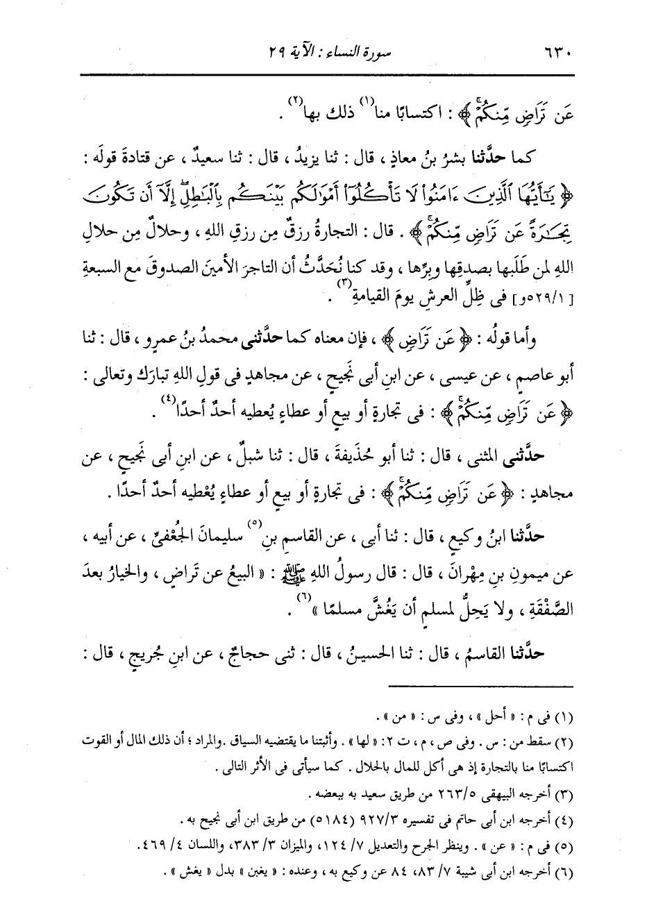 حَدَّثَنَا بِشْرُ بْنُ مُعَاذٍ , قَالَ: ثنا يَزِيدُ , قَالَ: ثنا سَعِيدٌ , عَنْ قَتَادَةَ: قَوْلُهُ {§يَا أَيُّهَا الَّذِينَ آمَنُوا لَا تَأْكُلُوا أَمْوَالَكُمْ بَيْنَكُمْ بِالْبَاطِلِ إِلَّا أَنْ تَكُونَ تِجَارَةً عَنْ تَرَاضٍ مِنْكُمْ} [النساء: 29] قَالَ: «التِّجَارَةُ رِزْقٌ مِنْ رِزْقِ اللَّهِ , وَحَلَالٌ مِنْ حَلَالِ اللَّهِ لِمَنْ طَلَبِهَا بِصِدْقِهَا وَبِرِّهَا , وَقَدْ كُنَّا نُحَدِّثُ أَنَّ التَّاجِرَ الْأَمِينَ الصَّدُوقَ مَعَ السَّبْعَةِ فِي ظِلِّ الْعَرْشِ يَوْمَ الْقِيَامَةِ»