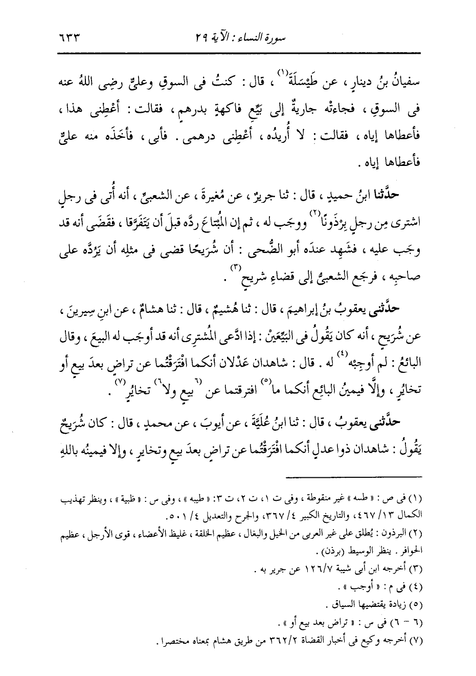 حَدَّثَنِي يَعْقُوبُ بْنُ إِبْرَاهِيمَ , قَالَ: ثنا هُشَيْمٌ , قَالَ: ثنا هِشَامٌ , عَنِ ابْنِ سِيرِينَ , عَنْ شُرَيْحٍ , أَنَّهُ كَانَ يَقُولُ فِي الْبَيِّعَيْنِ: " §إِذَا ادَّعَى الْمُشْتَرِي أَنَّهُ قَدْ أَوْجَبَ لَهُ الْبَيْعَ , وَقَالَ الْبَائِعُ: لَمْ أُوجِبْ لَهُ قَالَ شَاهِدَانِ عَدْلَانِ أَنَّكُمَا افْتَرَقْتُمَا عَنْ تَرَاضٍ بَعْدَ بَيْعٍ أَوْ تَخَايُرٍ , وَإِلَّا فَيَمِينُ الْبَائِعِ: أَنَّكُمَا مَا افْتَرَقْتُمَا عَنْ بَيْعٍ وَلَا تَخَايُرٍ "