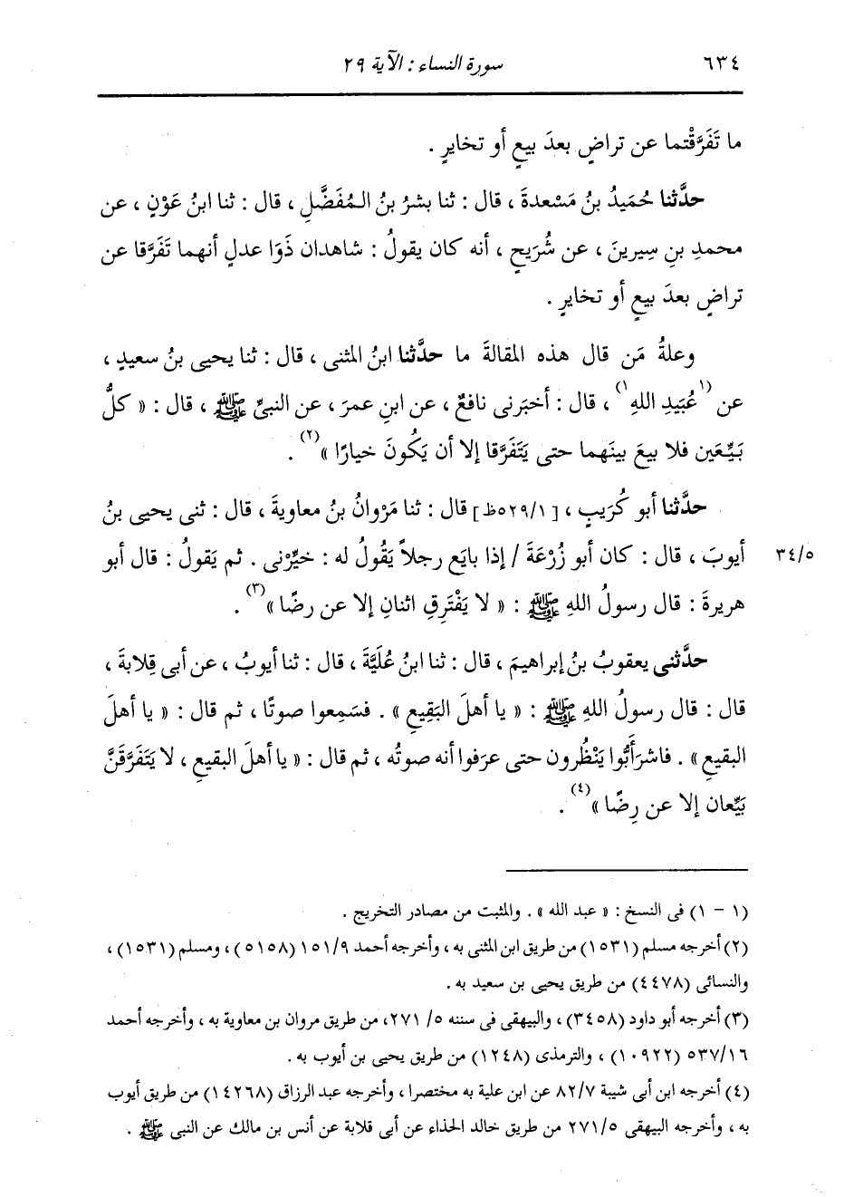 حَدَّثَنِي يَعْقُوبُ بْنُ إِبْرَاهِيمَ , قَالَ: ثنا ابْنُ عُلَيَّةَ , قَالَ: ثنا أَيُّوبُ , عَنْ أَبِي قِلَابَةَ , قَالَ: قَالَ رَسُولُ اللَّهِ صَلَّى اللهُ عَلَيْهِ وَسَلَّمَ: «يَا أَهْلَ الْبَقِيعِ» فَسَمِعُوا صَوْتَهُ , ثُمَّ قَالَ: «يَا أَهْلَ الْبَقِيعِ» فَاشْرَأَبُّوا يَنْظُرُونَ حَتَّى عَرَفُوا أَنَّهُ صَوْتُهُ , ثُمَّ قَالَ: «يَا أَهْلَ الْبَقِيعِ §لَا يَتَفَرَّقَنَّ بَيِّعَانِ إِلَّا عَنْ رِضًا»