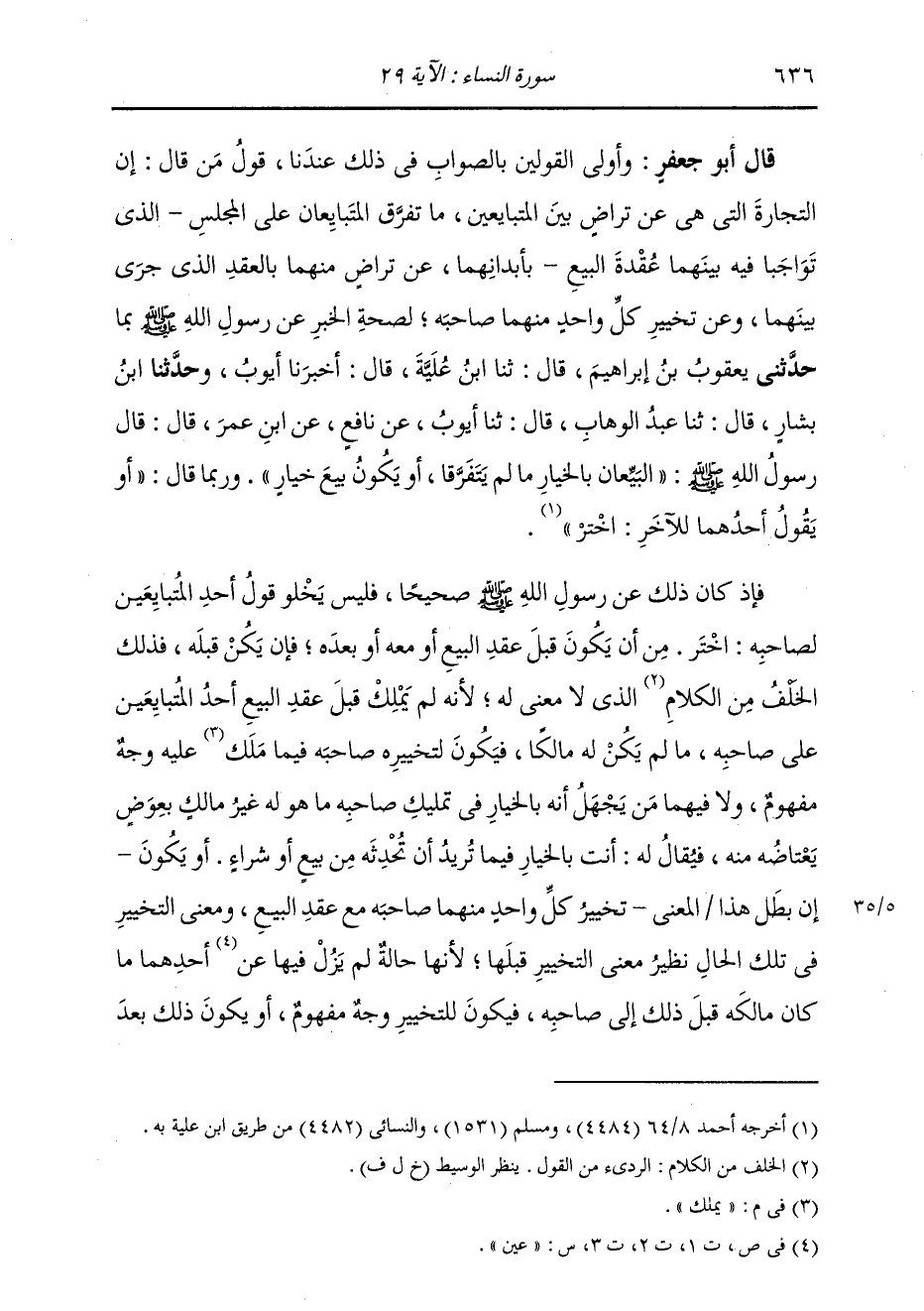 حَدَّثَنِي يَعْقُوبُ بْنُ إِبْرَاهِيمَ , قَالَ: ثنا ابْنُ عُلَيَّةَ , قَالَ: أَخْبَرَنَا أَيُّوبُ , وَحَدَّثَنَا ابْنُ بَشَّارٍ , قَالَ: ثنا عَبْدُ الْوَهَّابِ , قَالَ: ثنا أَيُّوبُ , عَنْ نَافِعٍ , عَنِ ابْنِ عُمَرَ , قَالَ: قَالَ رَسُولُ اللَّهِ صَلَّى اللهُ عَلَيْهِ وَسَلَّمَ: «§الْبَيِّعَانِ بِالْخِيَارِ مَا لَمْ يَتَفَرَّقَا , أَوْ يَكُونَ بَيْعُ خِيَارٍ» وَرُبَّمَا قَالَ: " أَوْ يَقُولُ أَحَدُهُمَا لِلْآخَرِ: اخْتَرْ " فَإِذْ كَانَ ذَلِكَ عَنْ رَسُولِ اللَّهِ صَلَّى اللهُ عَلَيْهِ وَسَلَّمَ صَحِيحًا , فَلَيْسَ يَخْلُو قَوْلُ أَحَدِ الْمُتَبَايِعَيْنِ لِصَاحِبِهِ: اخْتَرْ , مِنْ أَنْ يَكُونَ قَبْلَ عَقْدِ الْبَيْعِ , أَوْ مَعَهُ , أَوْ بَعْدَهُ. فَإِنْ يَكُنْ قَبْلَهُ , فَذَلِكَ الْخُلْفُ مِنَ الْكَلَامِ الَّذِي لَا مَعْنَى لَهُ , لِأَنَّهُ لَمْ يَمْلِكْ قَبْلَ عَقْدِ الْبَيْعِ أَحَدُ الْمُتَبَايِعَيْنِ عَلَى صَاحِبِهِ , مَا لَمْ يَكُنْ لَهُ مَالِكًا , فَيَكُونُ لِتَخْيِيرِهِ صَاحِبَهُ فِيمَا يَمْلِكُ عَلَيْهِ وَجْهٌ مَفْهُومٌ , وَلَا فِيهِمَا مَنْ يَجْهَلُ , أَنَّهُ بِالْخِيَارِ فِي تَمْلِيكِ صَاحِبِهِ مَا هُوَ لَهُ غَيْرُ مَالِكٍ بِعِوَضٍ يَعْتَاضُهُ مِنْهُ , فَيُقَالَ لَهُ: أَنْتَ بِالْخِيَارِ فِيمَا تُرِيدُ أَنْ تُحْدِثَهُ مِنْ بَيْعٍ أَوْ شِرَاءٍ. أَوْ يَكُونُ إِنْ بَطَلَ هَذَا الْمَعْنَى تَخْيِيرُ كُلِّ وَاحِدٍ مِنْهُمَا صَاحِبَهُ مَعَ عَقْدِ الْبَيْعِ , وَمَعْنَى التَّخْيِيرِ فِي تِلْكَ الْحَالِ , نَظِيرُ مَعْنَى التَّخْيِيرِ قَبْلَهَا , لِأَنَّهَا حَالَةٌ لَمْ يَزَلْ فِيهَا عَنْ أَحَدِهِمَا مَا كَانَ مَالِكَهُ قَبْلَ ذَلِكَ إِلَى صَاحِبِهِ , فَيَكُونُ لِلتَّخْيِيرِ وَجْهٌ مَفْهُومٌ. أَوْ يَكُونُ ذَلِكَ بَعْدَ -[637]- عَقْدِ الْبَيْعِ , إِذَا فَسَدَ هَذَانِ الْمَعْنَيَانِ. وَإِذَا كَانَ ذَلِكَ كَذَلِكَ صَحَّ أَنَّ الْمَعْنَىَ الْآخَرَ مِنْ قَوْلِ رَسُولِ اللَّهِ صَلَّى اللهُ عَلَيْهِ وَسَلَّمَ , أَعْنِي قَوْلَهُ: «مَا لَمْ يَتَفَرَّقَا» إِنَّمَا هُوَ التَّفَرُّقُ بَعْدَ عَقْدِ الْبَيْعِ , كَمَا كَانَ التَّخْيِيرُ بَعْدَهُ , وَإِذَا صَحَّ ذَلِكَ , فَسَدَ قَوْلُ مَنْ زَعَمَ أَنَّ مَعْنَى ذَلِكَ: إِنَّمَا هُوَ التَّفَرُّقُ بِالْقَوْلِ الَّذِي بِهِ يَكُونُ الْبَيْعُ. وَإِذَا فَسَدَ ذَلِكَ صَحَّ مَا قُلْنَا مِنْ أَنَّ التَّخْيِيرَ وَالِافْتِرَاقَ إِنَّمَا هُمَا مَعْنَيَانِ بِهِمَا يَكُونُ تَمَامُ الْبَيْعِ بَعْدَ عَقْدِهِ , وَصَحَّ تَأْوِيلُ مَنْ قَالَ: مَعْنَى قَوْلِهِ: {إِلَّا أَنْ تَكُونَ تِجَارَةً عَنْ تَرَاضٍ مِنْكُمْ} [النساء: 29] إِلَّا أَنْ يَكُونَ أَكْلُكُمُ الْأَمْوَالَ الَّتِي يَأْكُلُهَا بَعْضُكُمْ لِبَعْضٍ عَنْ مِلْكٍ مِنْكُمْ عَمَّنْ مَلَكْتُمُوهَا عَلَيْهِ بِتِجَارَةٍ تَبَايَعْتُمُوهَا بَيْنَكُمْ , وَافْتَرَقْتُمْ عَنْهَا , عَنْ تَرَاضٍ مِنْكُمْ بَعْدَ عَقْدِ الْبَيْعِ بَيْنَكُمْ بِأَبْدَانِكُمْ , أَوْ يُخَيِّرُ بَعْضُكُمْ بَعْضًا