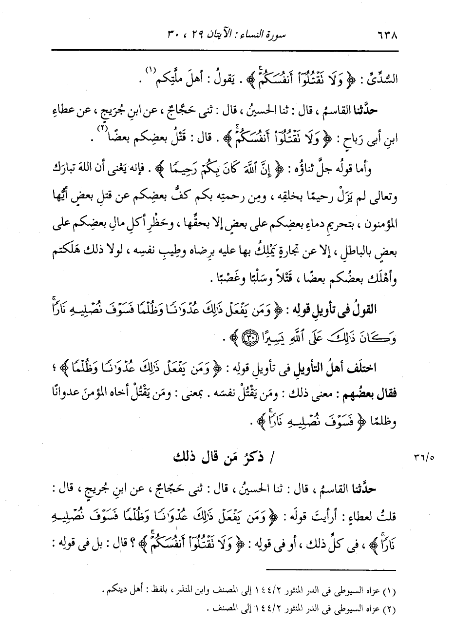 حَدَّثَنَا الْقَاسِمُ , قَالَ: ثنا الْحُسَيْنُ , قَالَ: ثني حَجَّاجٌ , عَنِ ابْنِ جُرَيْجٍ , عَنْ عَطَاءِ بْنِ أَبِي رَبَاحٍ: {§وَلَا تَقْتُلُوا أَنْفُسَكُمْ} [النساء: 29] قَالَ: «قَتْلُ بَعْضِكُمْ بَعْضًا» وَأَمَّا قَوْلُهُ جَلَّ ثَنَاؤُهُ: {إِنَّ اللَّهَ كَانَ بِكُمْ رَحِيمًا} [النساء: 29] فَإِنَّهُ يَعْنِي أَنَّ اللَّهَ تَبَارَكَ وَتَعَالَى لَمْ يَزَلْ رَحِيمًا بِخَلْقِهِ , وَمِنْ رَحْمَتِهِ بِكُمْ كَفَّ بَعْضَكُمْ عَنْ قَتْلِ بَعْضٍ أَيُّهَا الْمُؤْمِنُونَ , بِتَحْرِيمِ دِمَاءِ بَعْضِكُمْ عَلَى بَعْضٍ إِلَّا بِحَقِّهَا , وَحَظَرَ أَكْلَ مَالِ بَعْضِكُمْ عَلَى بَعْضِ بِالْبَاطِلِ , إِلَّا عَنْ تِجَارَةٍ يَمْلِكُ بِهَا عَلَيْهِ بِرِضَاهُ وَطِيبِ نَفْسِهِ , لَوْلَا ذَلِكَ هَلَكْتُمْ وَأَهْلَكَ بَعْضُكُمْ بَعْضًا قَتْلًا وَسَلْبًا وَغَصْبًا