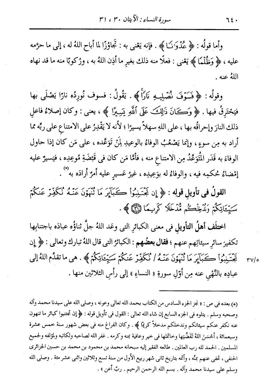 §الْقَوْلُ فِي تَأْوِيلِ قَوْلِهِ تَعَالَى: {إِنْ تَجْتَنِبُوا كَبَائِرَ مَا تُنْهَوْنَ عَنْهُ نُكَفِّرْ عَنْكُمْ سَيِّئَاتِكُمْ وَنُدْخِلْكُمْ مُدْخَلًا كَرِيمًا} [النساء: 31] اخْتَلَفَ أَهْلُ التَّأْوِيلِ فِي مَعْنَى الْكَبَائِرِ الَّتِي وَعَدَ اللَّهُ جَلَّ ثَنَاؤُهُ عِبَادَهُ بِاجْتِنَابِهَا تَكْفِيرَ سَائِرِ سَيِّئَاتِهِمْ عَنْهُمْ , فَقَالَ بَعْضُهُمْ: الْكَبَائِرُ الَّتِي قَالَ اللَّهُ تَبَارَكَ وَتَعَالَى: {إِنْ تَجْتَنِبُوا كَبَائِرَ مَا تُنْهَوْنَ عَنْهُ نُكَفِّرْ عَنْكُمْ سَيِّئَاتِكُمْ} [النساء: 31] هِيَ مَا تَقَدَّمَ اللَّهُ إِلَى عِبَادِهِ بِالنَّهْيِ عَنْهُ مِنْ أَوَّلِ سُورَةِ النِّسَاءِ إِلَى رَأْسِ الثَّلَاثِينَ مِنْهَا