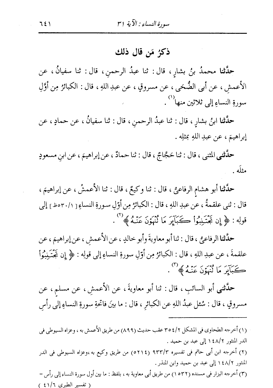 ذِكْرُ مَنْ قَالَ ذَلِكَ: حَدَّثَنَا مُحَمَّدُ بْنُ بَشَّارٍ , قَالَ: ثنا عَبْدُ الرَّحْمَنِ , قَالَ: ثنا سُفْيَانُ , عَنِ الْأَعْمَشِ , عَنْ أَبِي الضُّحَى , عَنْ مَسْرُوقٍ , عَنْ عَبْدِ اللَّهِ , قَالَ: «§الْكَبَائِرُ مِنْ أَوَّلِ سُورَةِ النِّسَاءِ إِلَى ثَلَاثِينَ مِنْهَا» حَدَّثَنَا ابْنُ بَشَّارٍ قَالَ: ثنا عَبْدُ الرَّحْمَنِ قَالَ: ثنا سُفْيَانُ , عَنْ حَمَّادٍ , عَنْ إِبْرَاهِيمَ , عَنْ عَبْدِ اللَّهِ بِمِثْلِهِ حَدَّثَنِي الْمُثَنَّى قَالَ: ثنا حَجَّاجٌ قَالَ: ثنا حَمَّادٌ , عَنْ إِبْرَاهِيمَ , عَنِ ابْنِ مَسْعُودٍ , مِثْلَهُ