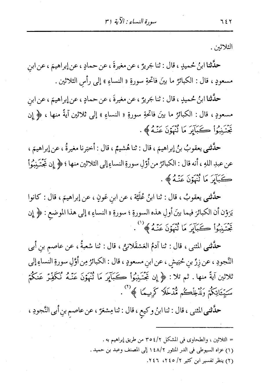 حَدَّثَنِي يَعْقُوبُ بْنُ إِبْرَاهِيمَ قَالَ: ثنا هُشَيْمٌ قَالَ: أَخْبَرَنَا مُغِيرَةُ , عَنْ إِبْرَاهِيمَ , عَنْ عَبْدِ اللَّهِ , أَنَّهُ قَالَ: §الْكَبَائِرُ مِنْ أَوَّلِ سُورَةِ النِّسَاءِ إِلَى الثَّلَاثِينَ مِنْهَا. {إِنْ تَجْتَنِبُوا كَبَائِرَ مَا تُنْهَوْنَ عَنْهُ} [النساء: 31]