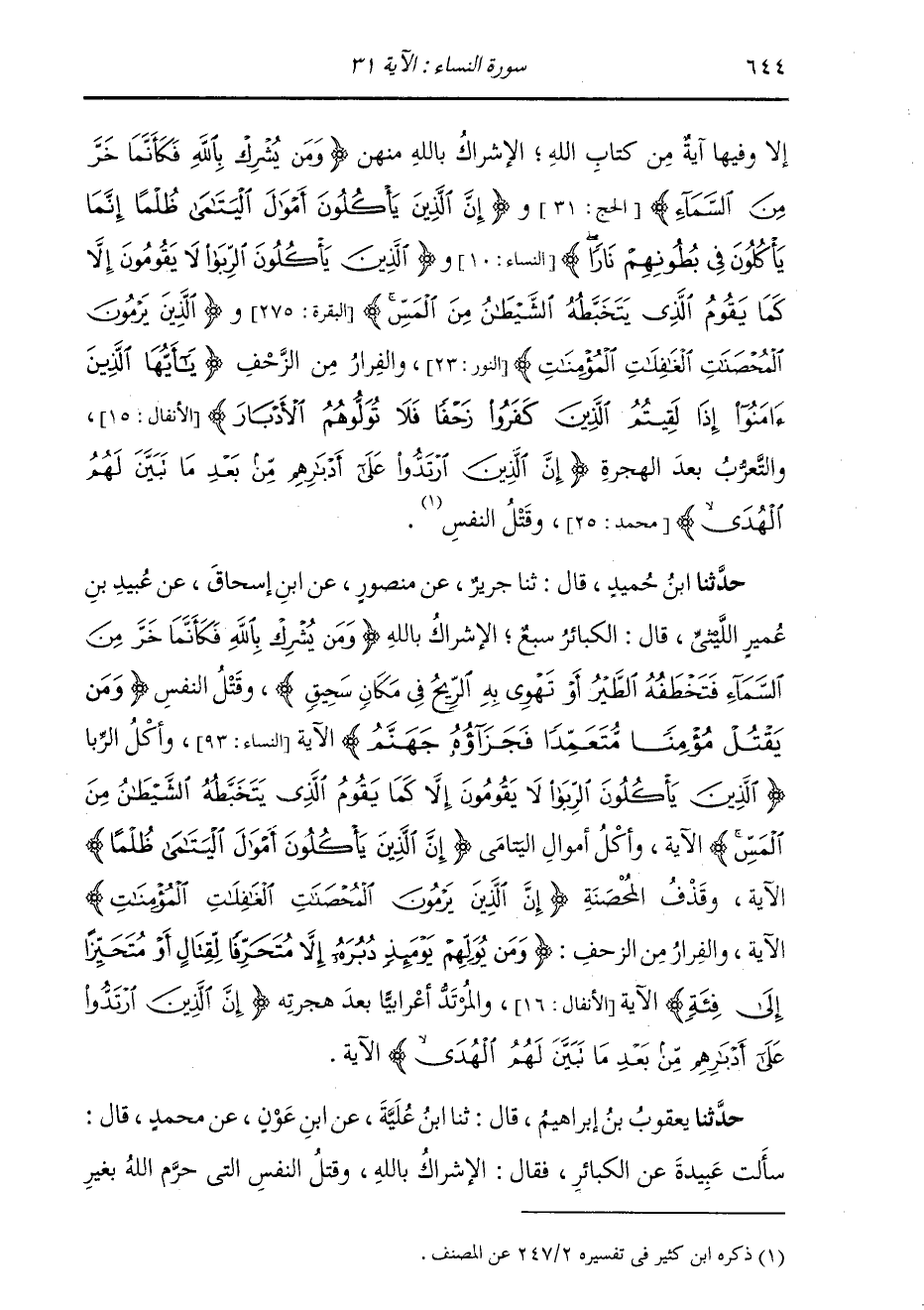 حَدَّثَنَا ابْنُ حُمَيْدٍ قَالَ: ثنا جَرِيرٌ , عَنْ مَنْصُورٍ , عَنِ ابْنِ إِسْحَاقَ , عَنْ عُبَيْدِ بْنِ عُمَيْرٍ اللَّيْثِيِّ قَالَ: " §الْكَبَائِرُ سَبْعٌ: الْإِشْرَاكُ بِاللَّهِ: {وَمَنْ يُشْرِكْ بِاللَّهِ فَكَأَنَّمَا خَرَّ مِنَ السَّمَاءِ فَتَخْطَفُهُ الطَّيْرُ أَوْ تَهْوِي بِهِ الرِّيحُ فِي مَكَانٍ سَحِيقٍ} [الحج: 31] وَقَتْلُ النَّفْسِ: {وَمَنْ يَقْتُلْ مُؤْمِنًا مُتَعَمِّدًا فَجَزَاؤُهُ جَهَنَّمُ} [النساء: 93] الْآيَةَ , وَأَكْلُ الرِّبَا: {الَّذِينَ يَأْكُلُونَ الرِّبَا لَا يَقُومُونَ إِلَّا كَمَا يَقُومُ الَّذِي يَتَخَبَّطُهُ الشَّيْطَانُ مِنَ الْمَسِّ} [البقرة: 275] الْآيَةُ , وَأَكْلُ أَمْوَالِ الْيَتَامَى: {إِنَّ الَّذِينَ يَأْكُلُونَ أَمْوَالَ الْيَتَامَى ظُلْمًا} [النساء: 10] الْآيَةُ , وَقَذْفُ الْمُحْصَنَةِ: {إِنَّ الَّذِينَ يَرْمُونَ} [النور: 23] الْمُحْصَنَاتِ الْغَافِلَاتِ الْمُؤْمِنَاتِ الْآيَةُ , وَالْفِرَارُ مِنَ الزَّحْفِ: {وَمَنْ يُوَلِّهِمْ يَوْمَئِذٍ دُبُرَهُ} [الأنفال: 16] إِلَّا مُتَحَرِّفًا لِقِتَالٍ أَوْ مُتَحَيِّزًا إِلَى فِئَةٍ الْآيَةُ. وَالْمُرْتَدُّ أَعْرَابِيًّا بَعْدَ هِجْرَتِهِ: {إِنَّ الَّذِينَ ارْتَدُّوا عَلَى أَدْبَارِهِمْ مِنْ بَعْدِ مَا تَبَيَّنَ لَهُمُ الْهُدَى} [محمد: 25] الْآيَةُ "