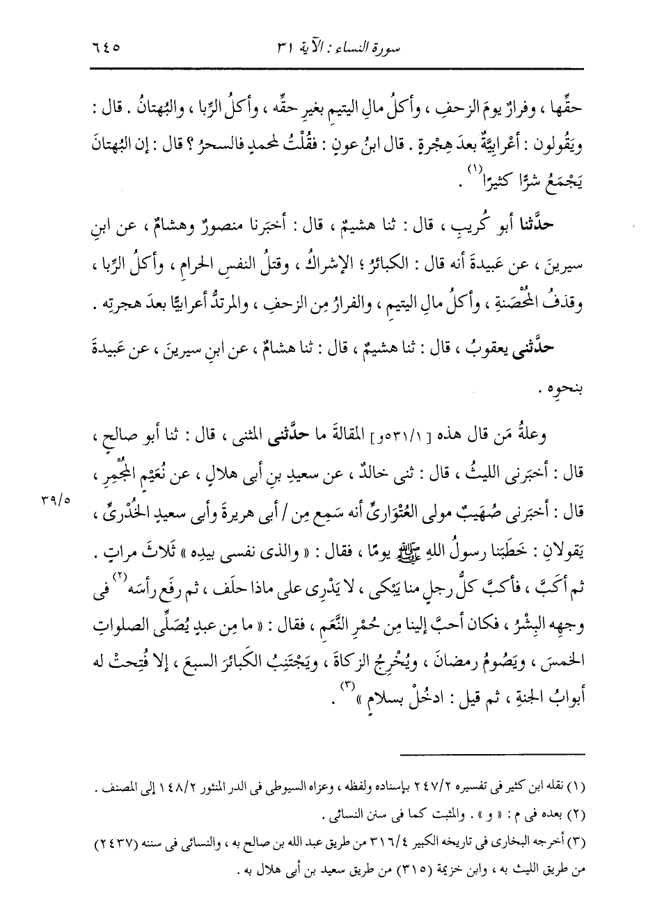 حَدَّثَنَا أَبُو كُرَيْبٍ , قَالَ: ثنا هُشَيْمٌ , قَالَ: أَخْبَرَنَا مَنْصُورٌ , وَهِشَامٌ , عَنِ ابْنِ سِيرِينَ , عَنْ عَبِيدَةَ , أَنَّهُ قَالَ: " §الْكَبَائِرُ: الْإِشْرَاكُ , وَقَتْلُ النَّفْسِ الْحَرَامِ , وَأَكْلُ الرِّبَا , وَقَذْفُ الْمُحْصَنَةِ , وَأَكْلُ مَالِ الْيَتِيمِ , وَالْفِرَارُ مِنَ الزَّحْفِ , وَالْمُرْتَدُّ أَعْرَابِيًّا بَعْدَ هِجْرَتِهِ " حَدَّثَنِي يَعْقُوبُ قَالَ: ثنا هُشَيْمٌ قَالَ: ثنا هِشَامٌ , عَنِ ابْنِ سِيرِينَ , عَنْ عَبِيدَةَ , بِنَحْوِهِ