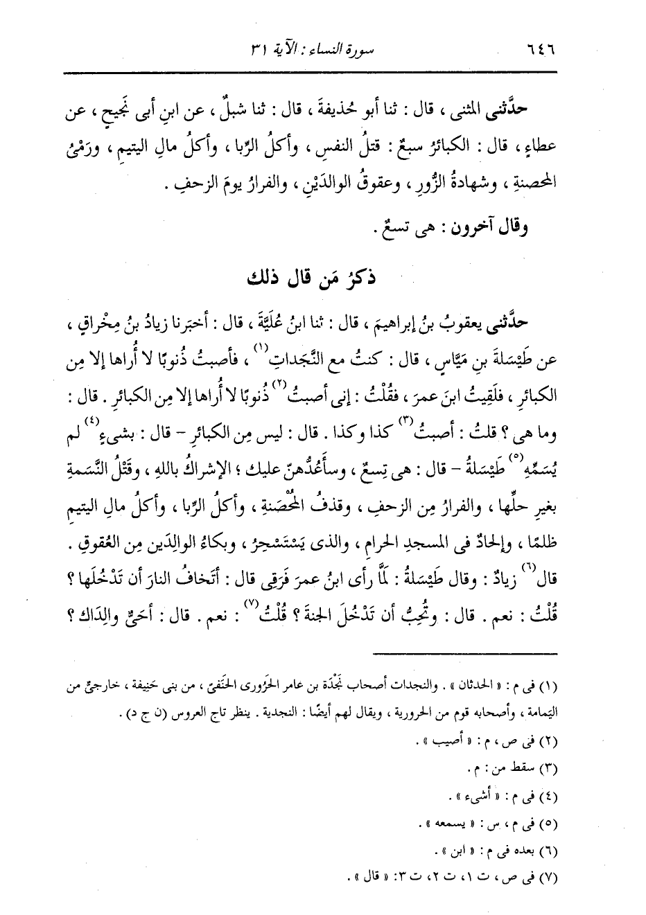 حَدَّثَنِي الْمُثَنَّى , قَالَ: ثنا أَبُو حُذَيْفَةَ , قَالَ: ثنا شِبْلٌ , عَنِ ابْنِ أَبِي نَجِيحٍ , عَنْ عَطَاءٍ , قَالَ: " §الْكَبَائِرُ سَبْعٌ: قَتْلُ النَّفْسِ , وَأَكْلُ الرِّبَا , وَأَكْلُ مَالِ الْيَتِيمِ , وَرَمْي الْمُحْصَنَةِ , وَشَهَادَةُ الزُّورِ , وَعُقُوقُ الْوَالِدَيْنِ , وَالْفِرَارُ يَوْمَ الزَّحْفِ " وَقَالَ آخَرُونَ: هِيَ تِسْعٌ