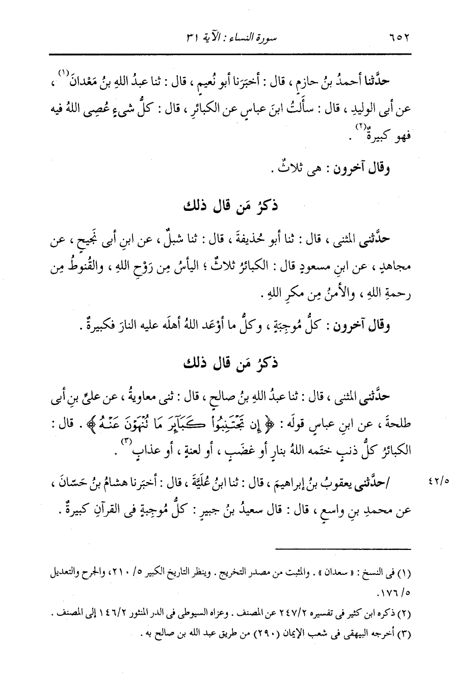 حَدَّثَنِي يَعْقُوبُ بْنُ إِبْرَاهِيمَ , قَالَ: ثنا ابْنُ عُلَيَّةَ , قَالَ: أَخْبَرَنَا هِشَامُ بْنُ حَسَّانَ , عَنْ مُحَمَّدِ بْنِ وَاسِعٍ، قَالَ: قَالَ سَعِيدُ بْنُ جُبَيْرٍ: «§كُلُّ مُوجِبَةٍ فِي الْقُرْآنِ كَبِيرَةٌ»