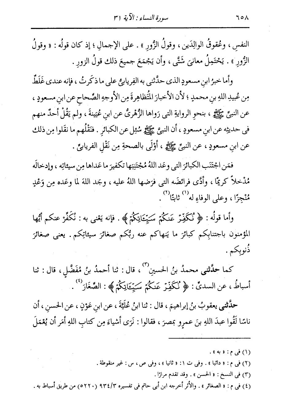حَدَّثَنِي مُحَمَّدُ بْنُ الْحُسَيْنِ , قَالَ: ثنا أَحْمَدُ بْنُ مُفَضَّلٍ , قَالَ: ثنا أَسْبَاطٌ , عَنِ السُّدِّيِّ: {§نُكَفِّرْ عَنْكُمْ سَيِّئَاتِكُمْ} [النساء: 31] الصَّغَائِرُ "