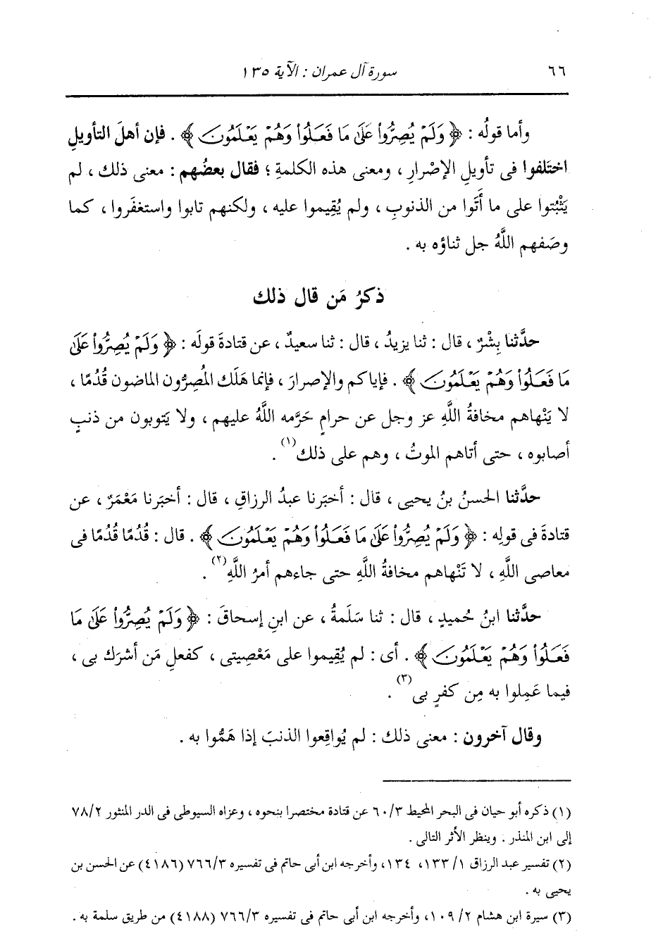 ذِكْرُ مَنْ قَالَ ذَلِكَ: حَدَّثَنَا بِشْرٌ، قَالَ: ثنا يَزِيدُ، قَالَ: ثنا سَعِيدٌ، عَنْ قَتَادَةَ، قَوْلُهُ: {§وَلَمْ يُصِرُّوا عَلَى مَا فَعَلُوا وَهُمْ يَعْلَمُونَ} [آل عمران: 135] «فَإِيَّاكُمْ وَالْإِصْرَارَ، فَإِنَّمَا هَلَكَ الْمُصِرُّونَ الْمَاضُونَ قُدُمًا، لَا يَنْهَاهُمْ مَخَافَةُ اللَّهِ عَنْ حَرَامٍ حَرَّمَهُ اللَّهُ عَلَيْهِمْ، وَلَا يَتُوبُونَ مِنْ ذَنْبٍ أَصَابُوهُ، حَتَّى أَتَاهُمُ الْمَوْتُ وَهُمْ عَلَى ذَلِكَ»