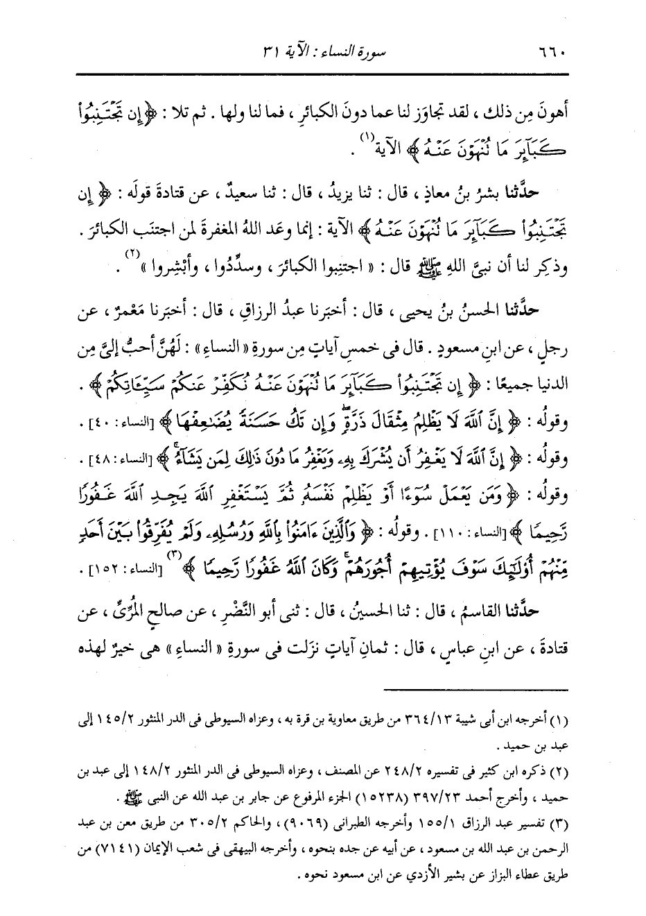 حَدَّثَنَا بِشْرُ بْنُ مُعَاذٍ , قَالَ: ثنا يَزِيدُ , قَالَ: ثنا سَعِيدٌ , عَنْ قَتَادَةَ , قَوْلُهُ: {إِنْ تَجْتَنِبُوا كَبَائِرَ مَا تُنْهَوْنَ عَنْهُ} [النساء: 31] الْآيَةُ , إِنَّمَا وَعَدَ اللَّهُ الْمَغْفِرَةَ لِمَنِ اجْتَنَبَ الْكَبَائِرَ , وَذُكِرَ لَنَا أَنَّ نَبِيَّ اللَّهِ صَلَّى اللهُ عَلَيْهِ وَسَلَّمَ قَالَ: «§اجْتَنِبُوا الْكَبَائِرَ , وَسَدِّدُوا , وَأَبْشِرُوا»