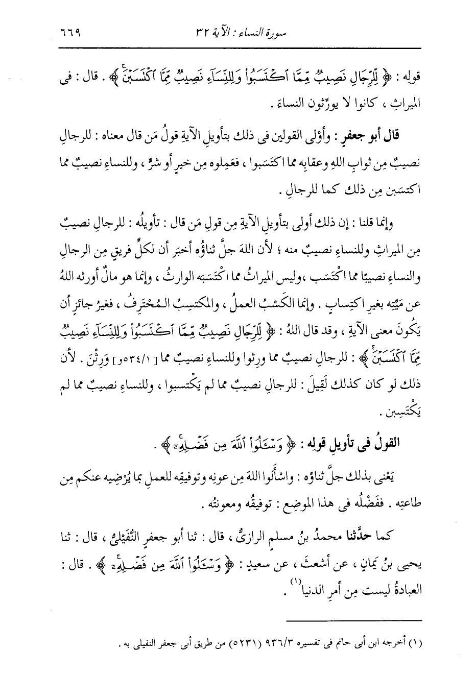 قَوْلِهِ: {§لِلرِّجَالِ نَصِيبٌ مِمَّا اكْتَسَبُوا وَلِلنِّسَاءِ نَصِيبٌ مِمَّا اكْتَسَبْنَ} [النساء: 32] قَالَ: «فِي الْمِيرَاثِ كَانُوا لَا يُوَرِّثُونَ النِّسَاءَ» قَالَ أَبُو جَعْفَرٍ: وَأَوْلَى الْقَوْلَيْنِ فِي ذَلِكَ بِتَأْوِيلِ الْآيَةِ قَوْلُ مَنْ قَالَ مَعْنَاهُ: لِلرِّجَالِ نَصِيبٌ مِنْ ثَوَابِ اللَّهِ وَعِقَابِهِ مِمَّا اكْتَسَبُوا , فَعَمِلُوهُ مِنْ خَيْرٍ أَوْ شَرٍّ , وَلِلنِّسَاءِ نَصِيبٌ مِمَّا اكْتَسَبْنَ مِنْ ذَلِكَ كَمَا لِلرِّجَالِ وَإِنَّمَا قُلْنَا إِنَّ ذَلِكَ أَوْلَى بِتَأْوِيلِ الْآيَةِ مِنْ قَوْلِ مَنْ قَالَ تَأْوِيلُهُ: لِلرِّجَالِ نَصِيبٌ مِنَ الْمِيرَاثِ , وَلِلنِّسَاءِ نَصِيبٌ مِنْهُ , لِأَنَّ اللَّهَ جَلَّ ثَنَاؤُهُ أَخْبَرَ أَنَّ لِكُلَّ فَرِيقٍ مِنَ الرِّجَالِ وَالنِّسَاءِ نَصِيبًا مِمَّا اكْتَسَبَ , وَلَيْسَ الْمِيرَاثُ مِمَّا اكْتَسَبَهُ الْوَارِثُ , وَإِنَّمَا هُوَ مَالٌ أَوْرَثَهُ اللَّهُ عَنْ مَيِّتِهِ بِغَيْرِ اكْتِسَابٍ , وَإِنَّمَا الْكَسْبُ الْعَمَلُ , وَالْمُكْتَسِبُ: الْمُحْتَرِفُ , فَغَيْرُ جَائِزٍ أَنْ يَكُونَ مَعْنَى الْآيَةِ , وَقَدْ قَالَ اللَّهُ: {لِلرِّجَالِ نَصِيبٌ مِمَّا اكْتَسَبُوا وَلِلنِّسَاءِ نَصِيبٌ مِمَّا اكْتَسَبْنَ} [النساء: 32] لِلرِّجَالِ نَصِيبٌ مِمَّا وَرِثُوا , وَلِلنِّسَاءِ نَصِيبٌ مِمَّا وَرَثْنَ؛ لِأَنَّ ذَلِكَ لَوْ كَانَ كَذَلِكَ لَقِيلَ: لِلرِّجَالِ نَصِيبٌ مِمَّا لَمْ يَكْتَسِبُوا , وَلِلنِّسَاءِ نَصِيبٌ مِمَّا لَمْ يَكْتَسِبْنَ