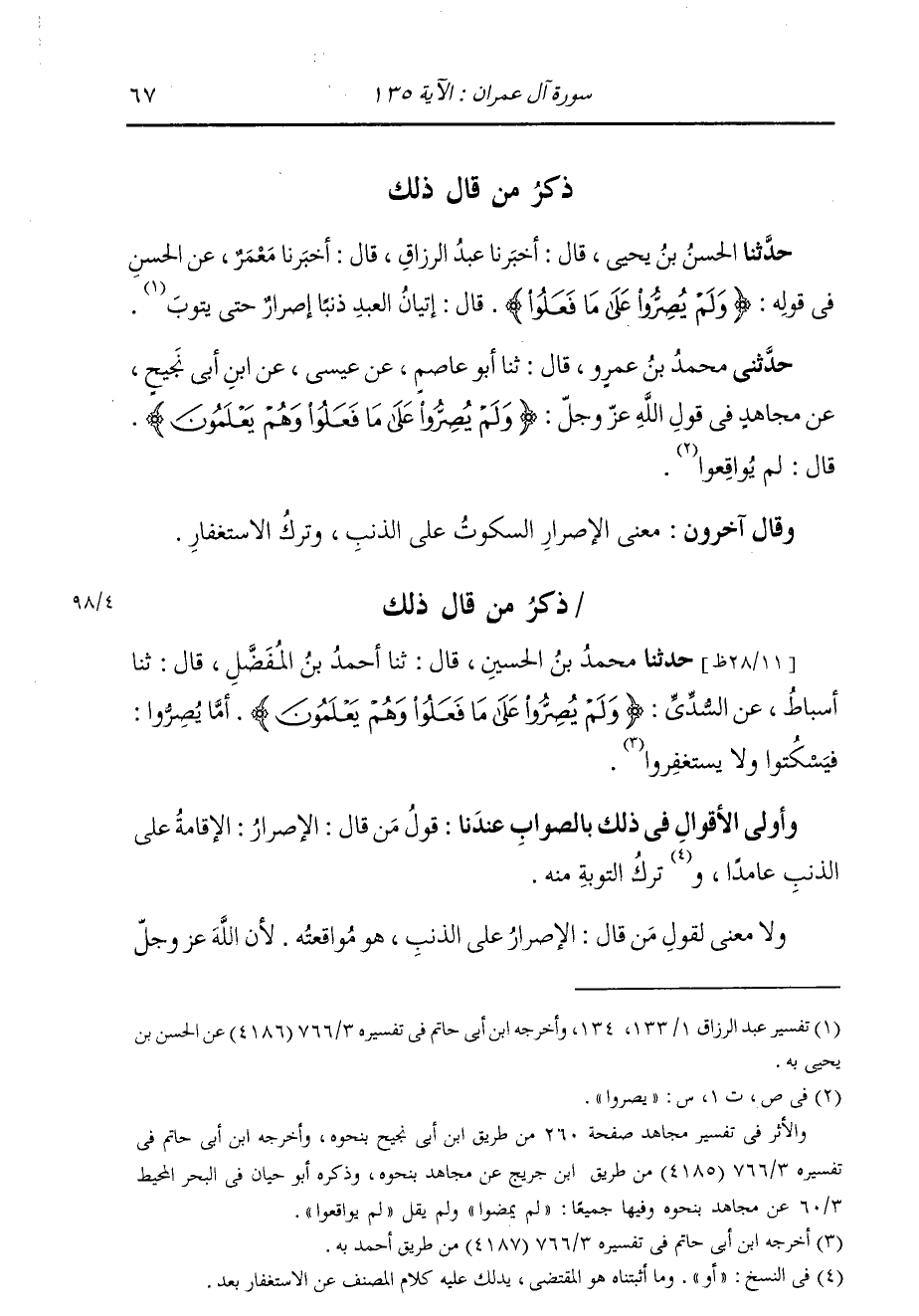ذِكْرُ مَنْ قَالَ ذَلِكَ: حَدَّثَنَا الْحَسَنُ بْنُ يَحْيَى، قَالَ: أَخْبَرَنَا عَبْدُ الرَّزَّاقِ، قَالَ: أَخْبَرَنَا مَعْمَرٌ، عَنِ الْحَسَنِ، فِي قَوْلِهِ: {§وَلَمْ يُصِرُّوا عَلَى مَا فَعَلُوا} [آل عمران: 135] قَالَ: «إِتْيَانُ الْعَبْدِ ذَنْبًا إِصْرَارًا حَتَّى يَتُوبَ»
