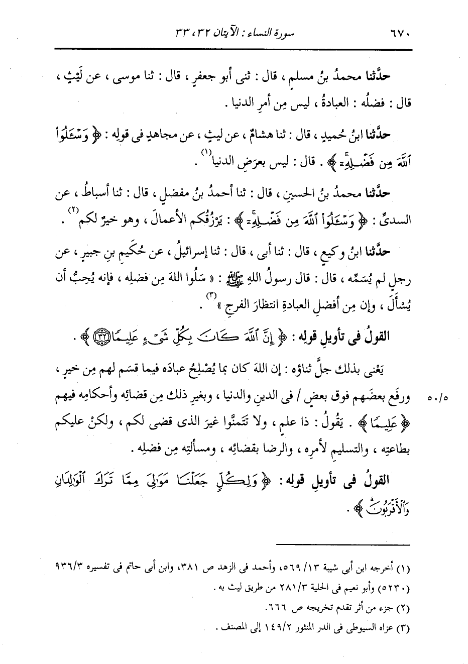 §الْقَوْلُ فِي تَأْوِيلِ قَوْلُهُ تَعَالَى: {إِنَّ اللَّهَ كَانَ بِكُلِّ شَيْءٍ عَلِيمًا} [النساء: 32] يَعْنِي بِذَلِكَ جَلَّ ثَنَاؤُهُ: إِنَّ اللَّهَ كَانَ بِمَا يُصْلِحُ عِبَادَهُ فِيمَا قَسَمَ لَهُمْ مِنْ خَيْرٍ , وَرَفَعَ بَعْضَهُمْ فَوْقَ بَعْضٍ فِي الدِّينِ وَالدُّنْيَا , وَبِغَيْرِ ذَلِكَ مِنْ قَضَائِهِ وَأَحْكَامِهِ فِيهِمْ عَلِيمًا يَقُولُ: " ذَا عِلْمٍ , وَلَا تَتَمَنَّوْا غَيْرَ الَّذِي قَضَى لَكُمْ , وَلَكِنْ عَلَيْكُمْ بِطَاعَتِهِ وَالتَّسْلِيمِ لِأَمْرِهِ , وَالرِّضَا بِقَضَائِهِ وَمَسْأَلَتِهِ مِنْ فَضْلِهِ