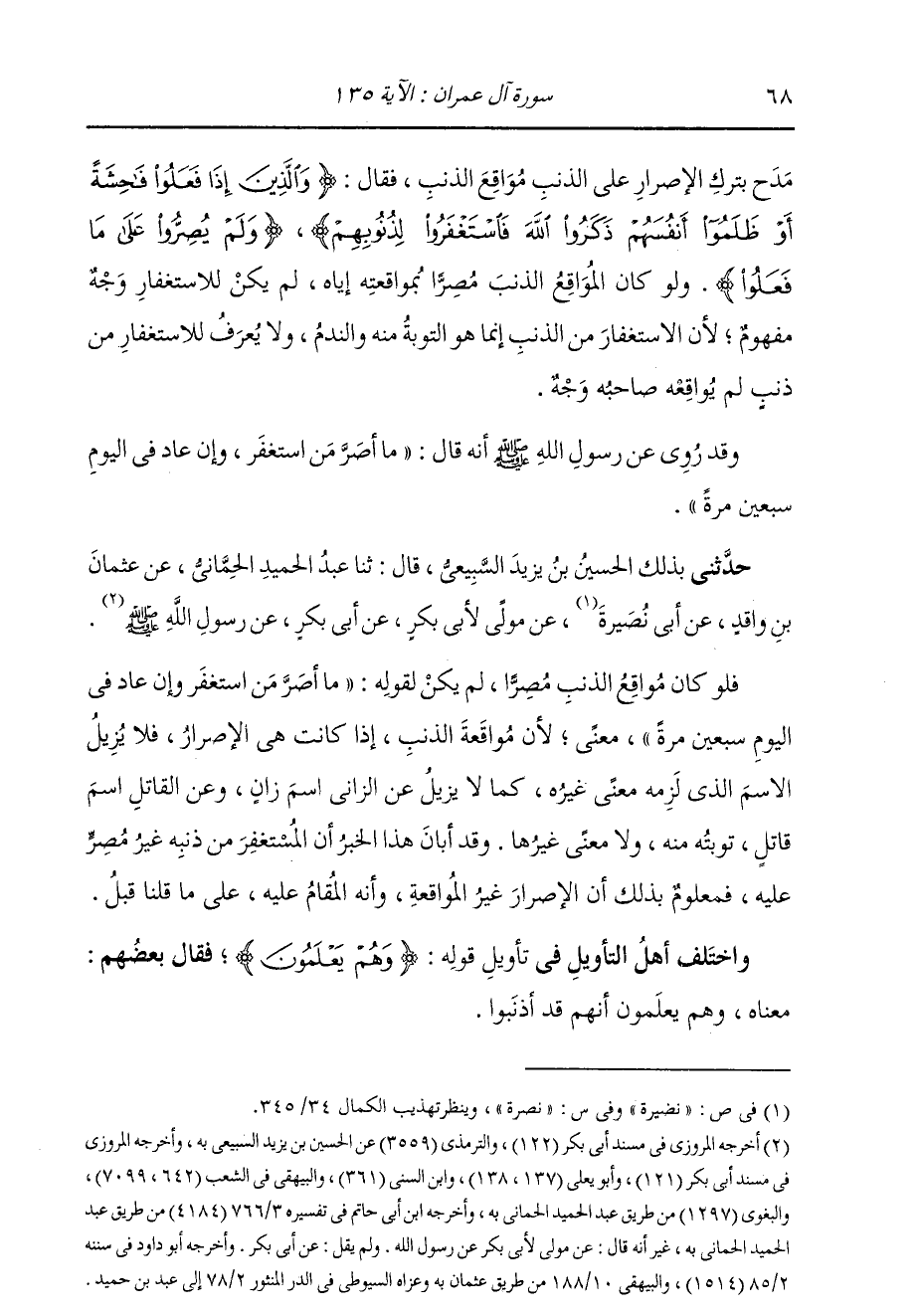 وَقَدْ رُوِيَ عَنِ النَّبِيِّ صَلَّى اللهُ عَلَيْهِ وَسَلَّمَ أَنَّهُ قَالَ: «§مَا أَصَرَّ مَنِ اسْتَغْفَرَ وَإِنْ عَادَ فِي الْيَوْمِ سَبْعِينَ مَرَّةً» حَدَّثَنِي بِذَلِكَ الْحُسَيْنُ بْنُ يَزِيدَ السَّبِيعِيُّ، قَالَ: ثنا عَبْدُ الْحَمِيدِ الْحِمَّانِيُّ، عَنْ عُثْمَانَ بْنِ وَاقِدٍ، عَنْ أَبِي نُصَيْرَةَ، عَنْ مَوْلًى لِأَبِي بَكْرٍ، عَنْ أَبِي بَكْرٍ، عَنْ رَسُولِ اللَّهِ صَلَّى اللهُ عَلَيْهِ وَسَلَّمَ. فَلَوْ كَانَ مُوَاقِعُ الذَّنْبِ مُصِرًّا، لَمْ يَكُنْ لِقَوْلِهِ «مَا أَصَرَّ مَنِ اسْتَغْفَرَ وَإِنْ عَادَ فِي الْيَوْمِ سَبْعِينَ مَرَّةً» مَعْنًى، لِأَنَّ مُوَاقَعَةَ الذَّنْبِ، إِذَا كَانَتْ هِيَ الْإِصْرَارَ، فَلَا يُزِيلُ الِاسْمُ الَّذِي لَزِمَهُ مَعْنَى غَيْرِهِ، كَمَا لَا يُزِيلُ عَنِ الزَّانِي اسْمَ زَانٍ، وَعَنِ الْقَاتِلِ اسْمَ قَاتِلٍ تَوْبَتُهُ مِنْهُ، وَلَا مَعْنَى غَيْرِهَا، وَقَدْ أَبَانَ هَذَا الْخَبَرُ أَنَّ الْمُسْتَغْفِرَ مِنْ ذَنْبِهِ غَيْرُ مُصِرٍّ عَلَيْهِ، فَمَعْلُومٌ بِذَلِكَ أَنَّ الْإِصْرَارَ غَيْرُ الْمُوَاقَعَةِ، وَأَنَّهُ الْمُقَامُ عَلَيْهِ عَلَى مَا قُلْنَا قَبْلُ. وَاخْتَلَفَ أَهْلُ التَّأْوِيلِ فِي تَأْوِيلِ قَوْلِهِمْ: {وَهُمْ يَعْلَمُونَ} [آل عمران: 135] فَقَالَ بَعْضُهُمْ: مَعْنَاهُ: وَهُمْ يَعْلَمُونَ أَنَّهُمْ قَدْ أَذْنَبُوا