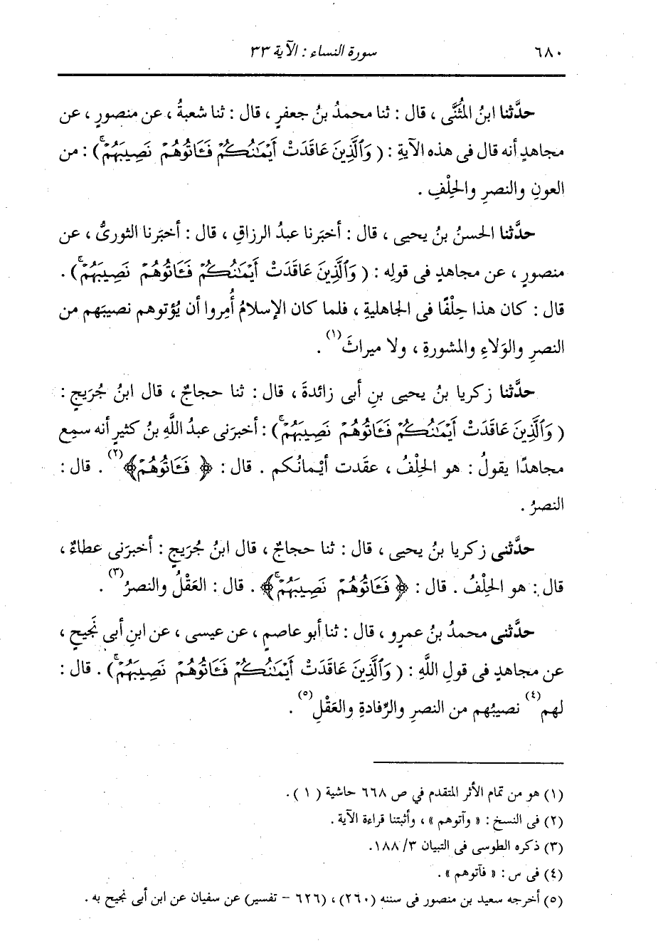 حَدَّثَنَا زَكَرِيَّا بْنُ يَحْيَى بْنِ أَبِي زَائِدَةَ , قَالَ: ثنا حَجَّاجٌ , قَالَ ابْنُ جُرَيْجٍ: (§وَالَّذِينَ عَاقَدَتْ أَيْمَانُكُمْ) أَخْبَرَنِي عَبْدُ اللَّهِ بْنُ كَثِيرٍ , أَنَّهُ سَمِعَ مُجَاهِدًا , يَقُولُ: هُوَ الْحِلْفُ عَقَدَتْ أَيْمَانُكُمْ قَالَ: وَآتُوهُمْ نَصِيبَهُمْ قَالَ: النَّصْرُ "