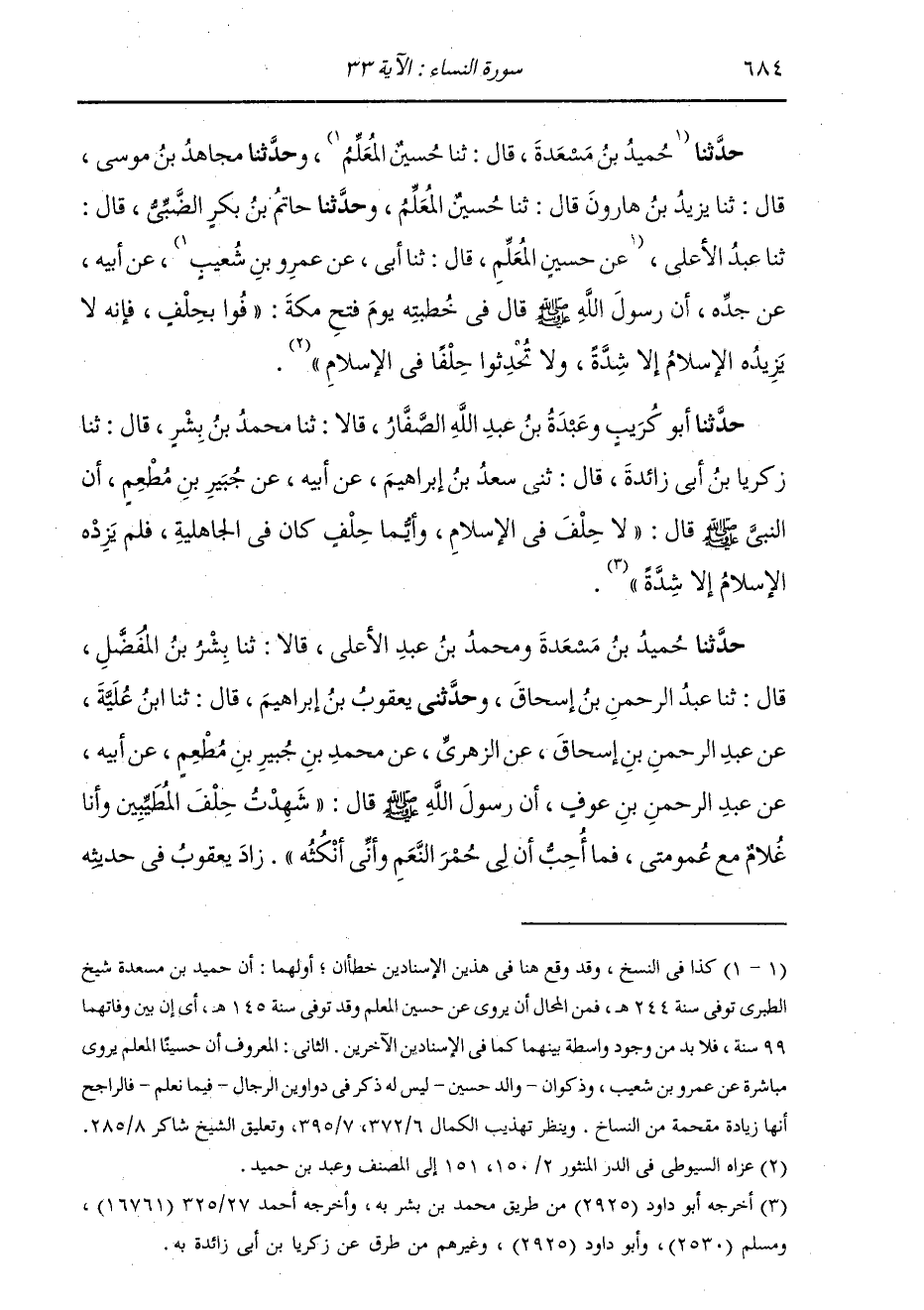 حَدَّثَنَا حُمَيْدُ بْنُ مَسْعَدَةَ , وَمُحَمَّدُ بْنُ عَبْدِ الْأَعْلَى , قَالَا: ثنا بِشْرُ بْنُ الْمُفَضَّلِ , قَالَ: ثنا عَبْدُ الرَّحْمَنِ بْنُ إِسْحَاقَ , وَحَدَّثَنِي يَعْقُوبُ بْنُ إِبْرَاهِيمَ , قَالَ: ثنا ابْنُ عُلَيَّةَ , عَنْ عَبْدِ الرَّحْمَنِ بْنِ إِسْحَاقَ , عَنِ الزُّهْرِيِّ , عَنْ مُحَمَّدِ بْنِ جُبَيْرِ بْنِ مُطْعِمٍ , عَنْ أَبِيهِ , عَنْ عَبْدِ الرَّحْمَنِ بْنِ عَوْفٍ , أَنَّ رَسُولَ اللَّهِ صَلَّى اللهُ عَلَيْهِ وَسَلَّمَ قَالَ: «§شَهِدْتُ حِلْفَ الْمُطَيَّبِينَ وَأَنَا غُلَامٌ مَعَ عُمُومَتِي , فَمَا أُحِبُّ أَنَّ لِيَ حُمْرَ النَّعَمِ وَأَنِّي أَنْكُثُهُ»