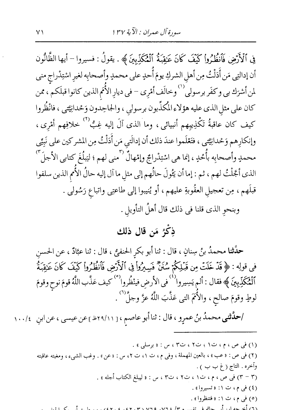 ذِكْرُ مَنْ قَالَ ذَلِكَ: حَدَّثَنَا مُحَمَّدُ بْنُ سِنَانٍ، قَالَ: ثنا أَبُو بَكْرٍ، قَالَ: ثنا عَبَّادٌ، عَنِ الْحَسَنِ، فِي قَوْلِهِ: {§قَدْ خَلَتْ مِنْ قَبْلِكُمْ سُنَنٌ فَسِيرُوا فِي الْأَرْضِ فَانْظُرُوا كَيْفَ كَانَ عَاقِبَةُ الْمُكَذِّبِينَ} [آل عمران: 137] فَقَالَ: «أَلَمْ تَسِيرُوا فِي الْأَرْضِ، فَتَنْظُرُوا كَيْفَ عَذَّبَ اللَّهُ قَوْمَ نُوحٍ، وَقَوْمَ لُوطٍ، وَقَوْمَ صَالِحٍ، وَالْأُمَمَ الَّتِي عَذَّبَ اللَّهُ عَزَّ وَجَلَّ؟»