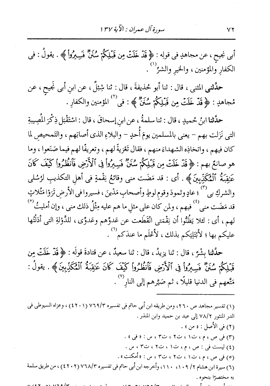 حَدَّثَنِي الْمُثَنَّى، قَالَ: ثنا أَبُو حُذَيْفَةَ، قَالَ: ثنا شِبْلٌ، عَنِ ابْنِ أَبِي نَجِيحٍ، عَنْ مُجَاهِدٍ: {§قَدْ خَلَتْ مِنْ قَبْلِكُمْ سُنَنٌ} [آل عمران: 137] «فِي الْمُؤْمِنِينَ وَالْكُفَّارِ»