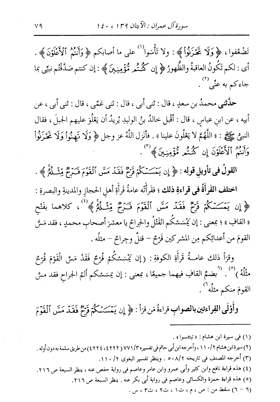 §الْقَوْلُ فِي تَأْوِيلِ قَوْلِهِ تَعَالَى: {إِنْ يَمْسَسْكُمْ قَرْحٌ فَقَدْ مَسَّ الْقَوْمَ قَرْحٌ مِثْلُهُ وَتِلْكَ الْأَيَّامُ نُدَاوِلُهَا بَيْنَ النَّاسِ وَلِيَعْلَمَ اللَّهُ الَّذِينَ آمَنُوا وَيَتَّخِذَ مِنْكُمْ شُهَدَاءَ وَاللَّهُ لَا يُحِبُّ الظَّالِمِينَ} [آل عمران: 140] اخْتَلَفَ الْقُرَّاءُ فِي قِرَاءَةِ ذَلِكَ، فَقَرَأَتْهُ عَامَّةُ قُرَّاءِ أَهْلِ الْحِجَازِ وَالْمَدِينَةِ وَالْبَصْرَةِ: {إِنْ يَمْسَسْكُمْ قَرْحٌ فَقَدْ مَسَّ الْقَوْمَ قَرْحٌ مِثْلُهُ} [آل عمران: 140] كِلَاهُمَا بِفَتْحِ الْقَافِ، بِمَعْنَى: إِنْ يَمْسَسْكُمُ الْقَتْلُ وَالْجِرَاحُ يَا مَعْشَرَ أَصْحَابِ مُحَمَّدٍ، فَقَدْ مَسَّ الْقَوْمَ مِنْ أَعْدَائِكُمْ مِنَ الْمُشْرِكِينَ قَرْحُ قَتْلٍ وَجِرَاحٍ مِثْلُهُ، وَقَرَأَ عَامَّةُ قُرَّاءِ الْكُوفَةِ: (إِنْ يَمْسَسْكُمْ قُرْحٌ فَقَدْ مَسَّ الْقَوْمَ قُرْحٌ مِثْلُهُ) وَأَوْلَى الْقِرَاءَتَيْنِ بِالصَّوَابِ، قِرَاءَةُ مَنْ قَرَأَ: {إِنْ يَمْسَسْكُمْ قَرْحٌ فَقَدْ مَسَّ الْقَوْمَ