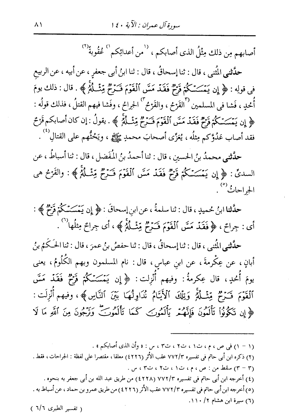 حَدَّثَنِي الْمُثَنَّى، قَالَ: ثنا إِسْحَاقُ، قَالَ: ثنا حَفْصُ بْنُ عُمَرَ، قَالَ: ثنا الْحَكَمُ بْنُ أَبَانَ، عَنْ عِكْرِمَةَ، عَنِ ابْنِ عَبَّاسٍ، قَالَ: " نَامَ الْمُسْلِمُونَ وَبِهِمُ الْكُلُومُ - يَعْنِي يَوْمَ أُحُدٍ - قَالَ عِكْرِمَةُ: وَفِيهِمْ أُنْزِلَتْ: {§إِنْ يَمْسَسْكُمْ قَرْحٌ} [آل عمران: 140] فَقَدْ مَسَّ الْقَوْمَ قَرْحٌ مِثْلُهُ وَتِلْكَ الْأَيَّامُ نُدَاوِلُهَا بَيْنَ النَّاسِ وَفِيهِمْ أُنْزِلَتْ: {إِنْ تَكُونُوا تَأْلَمُونَ فَإِنَّهُمْ يَأْلَمُونَ كَمَا تَأْلَمُونَ وَتَرْجُونَ مِنَ اللَّهِ مَا لَا -[82]- يَرْجُونَ} [النساء: 104] ، وَأَمَّا تَأْوِيلُ قَوْلِهِ: {إِنْ يَمْسَسْكُمْ قَرْحٌ} [آل عمران: 140] فَإِنَّهُ: «إِنْ يُصِبْكُمْ»