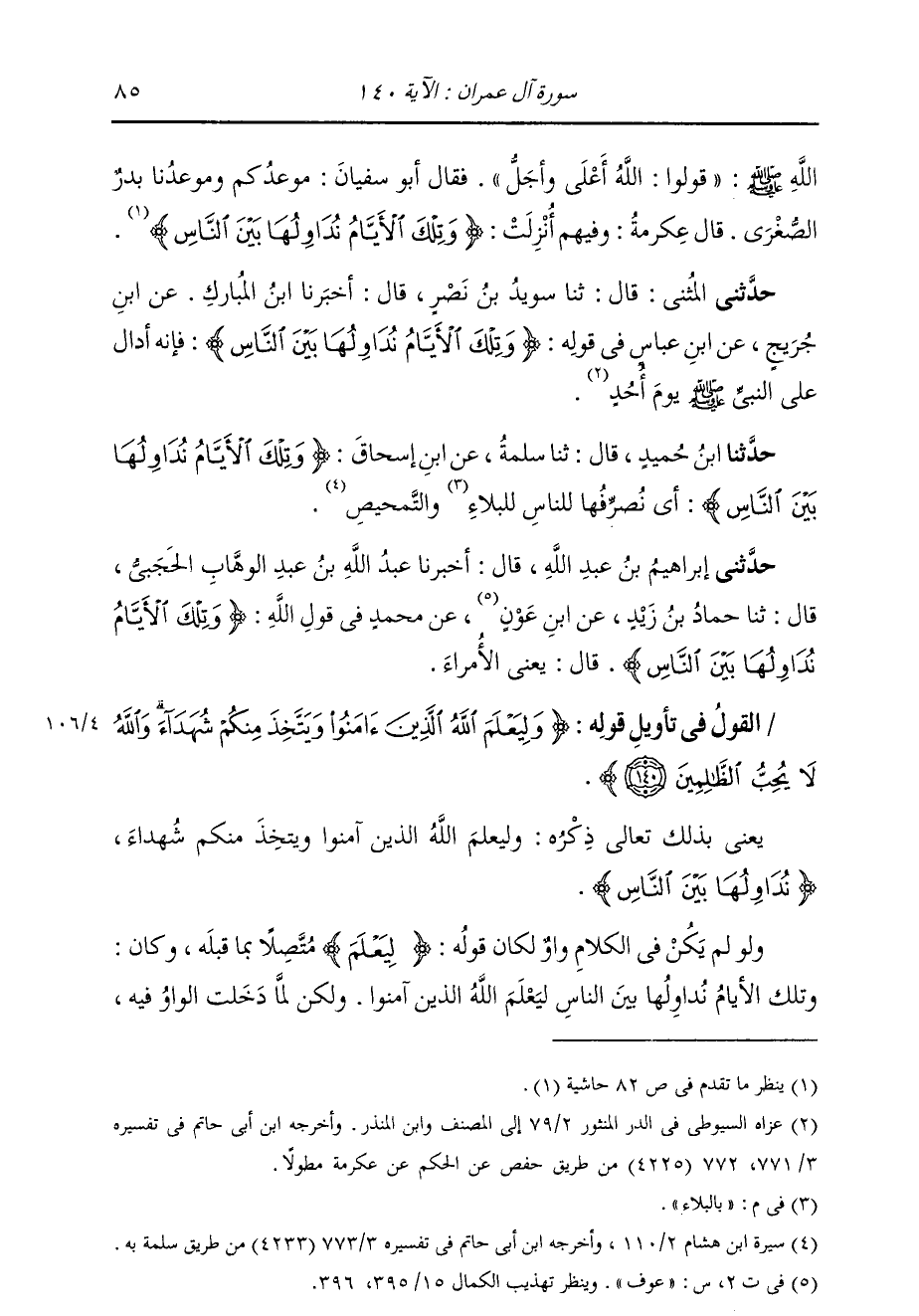 حَدَّثَنَا ابْنُ حُمَيْدٍ، قَالَ: ثنا سَلَمَةُ، عَنِ ابْنِ إِسْحَاقَ: {§وَتِلْكَ الْأَيَّامُ نُدَاوِلُهَا بَيْنَ النَّاسِ} [آل عمران: 140] «أَيْ نُصَرِّفُهَا لِلنَّاسِ بِالْبَلَاءِ وَالتَّمْحِيصِ»