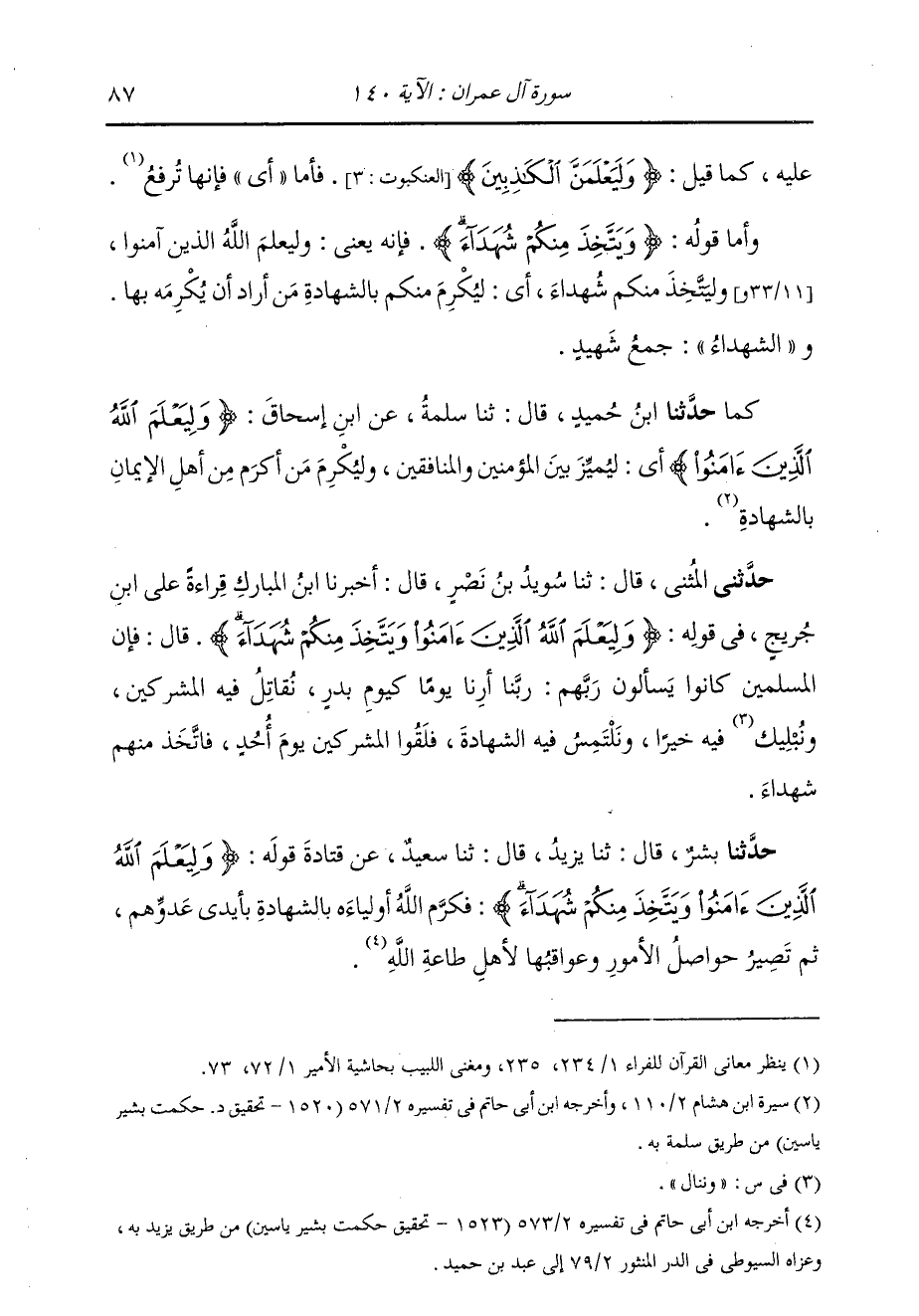 حَدَّثَنِي الْمُثَنَّى، قَالَ: ثنا سُوَيْدُ بْنُ نَصْرٍ، قَالَ: أَخْبَرَنَا ابْنُ الْمُبَارَكِ، قِرَاءَةً عَلَى ابْنِ جُرَيْجٍ فِي قَوْلِهِ: {§وَلِيَعْلَمَ اللَّهُ الَّذِينَ آمَنُوا وَيَتَّخُذَ مِنْكُمْ شُهَدَاءَ} [آل عمران: 140] قَالَ: " فَإِنَّ الْمُسْلِمِينَ كَانُوا يَسْأَلُونَ رَبَّهُمْ: رَبَّنَا أَرِنَا يَوْمًا كَيَوْمِ بَدْرٍ، نُقَاتِلُ فِيهِ الْمُشْرِكِينَ، وَنُبْلِيكَ فِيهِ خَيْرًا، وَنَلْتَمِسُ فِيهِ الشَّهَادَةَ فَلَقُوا الْمُشْرِكِينَ يَوْمَ أُحُدٍ، فَاتَّخَذَ مِنْهُمْ شُهَدَاءَ "