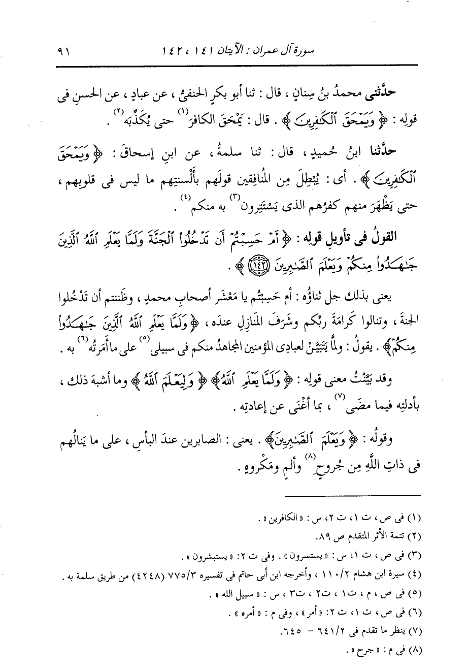§الْقَوْلُ فِي تَأْوِيلِ قَوْلِهِ تَعَالَى: {أَمْ حَسِبْتُمْ أَنْ تَدْخُلُوا الْجَنَّةَ وَلَمَّا يَعْلَمِ اللَّهُ الَّذِينَ جَاهِدُوا مِنْكُمْ وَيَعْلَمَ الصَّابِرِينَ} [آل عمران: 142] يَعْنِي بِذَلِكَ جَلَّ ثناؤُهُ: أَمْ حَسِبْتُمْ يَا مَعْشَرَ أَصْحَابِ مُحَمَّدٍ، وَظَنَنْتُمْ أَنْ تَدْخُلُوا الْجَنَّةَ، وَتَنَالُوا كَرَامَةَ رَبِّكُمْ، وَشَرَفَ الْمَنَازِلِ عِنْدَهُ؛ {وَلَمَّا يَعْلَمِ اللَّهُ الَّذِينَ جَاهَدُوا مِنْكُمْ} [آل عمران: 142] يَقُولُ: وَلَمَّا يَتَبَيَّنْ لِعِبَادِي الْمُؤْمِنِينَ، الْمُجَاهِدُ مِنْكُمْ فِي سَبِيلِ اللَّهِ، عَلَى مَا أَمَرَهُ بِهِ، وَقَدْ بَيَّنْتُ مَعْنَى قَوْلِهِ: {وَلَمَّا يَعْلَمِ اللَّهُ} [آل عمران: 142] وَلِيَعْلَمَ اللَّهُ، وَمَا أَشْبَهَ ذَلِكَ بِأَدِلَّتِهِ فِيمَا مَضَى بِمَا أَغْنَى عَنْ إِعَادَتِهِ وَقَوْلُهُ: {وَيَعْلَمَ الصَّابِرِينَ} [آل عمران: 142] يَعْنِي الصَّابِرِينَ عِنْدَ الْبَأْسِ عَلَى مَا يَنَالُهُمْ فِي ذَاتِ اللَّهِ مِنْ جَرْحٍ وَأَلَمٍ وَمَكْرُوهٍ