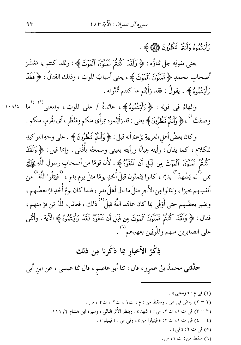 رَأَيْتُمُوهُ وَأَنْتُمْ تَنْظُرُونَ} [آل عمران: 143] يَعْنِي بِقَوْلِهِ جَلَّ ثناؤُهُ: {وَلَقَدْ كُنْتُمْ تَمَنَّوْنَ الْمَوْتَ} [آل عمران: 143] وَلَقَدْ كُنْتُمْ يَا مَعْشَرَ أَصْحَابِ مُحَمَّدٍ تَمَنَّوْنَ الْمَوْتَ يَعْنِي أَسْبَابَ الْمَوْتِ وَذَلِكَ الْقِتَالَ؛ {فَقَدْ رَأَيْتُمُوهُ} [آل عمران: 143] فَقَدْ رَأَيْتُمْ مَا كُنْتُمْ تَمَنَّوْنَهُ، وَالْهَاءُ فِي قَوْلِهِ {رَأَيْتُمُوهُ} [آل عمران: 143] ، عَائِدَةٌ عَلَى الْمَوْتِ، وَمَعْنَى: {وَأَنْتُمْ تَنْظُرُونَ} [البقرة: 50] يَعْنِي: قَدْ رَأَيْتُمُوهُ بِمَرْأًى مِنْكُمْ وَمَنْظَرٍ: أَيْ بِقُرْبٍ مِنْكُمْ، وَكَانَ بَعْضُ أَهْلِ الْعَرَبِيَّةِ يَزْعُمُ أَنَّهُ قِيلَ: {وَأَنْتُمْ تَنْظُرُونَ} [البقرة: 50] عَلَى وَجْهِ التَّوْكِيدِ لِلْكَلَامِ، كَمَا يُقَالُ: رَأَيْتُهُ عِيَانًا، وَرَأَيْتُهُ بِعَيْنَيَّ، وَسَمِعْتُهُ بِأُذُنَيَّ؛ وَإِنَّمَا قِيلَ: {وَلَقَدْ كُنْتُمْ تَمَنَّوْنَ الْمَوْتَ مِنْ قَبْلِ أَنْ تَلْقَوْهُ} [آل عمران: 143] ، لِأَنَّ قَوْمًا مِنْ أَصْحَابِ رَسُولِ اللَّهِ صَلَّى اللهُ عَلَيْهِ وَسَلَّمَ مِمَّنْ لَمْ يَشْهَدْ بَدْرًا، كَانُوا يَتَمَنَّوْنَ قَبْلَ أُحُدٍ يَوْمًا مِثْلَ يَوْمِ بَدْرٍ، فَيُبْلُوا اللَّهَ مِنْ أَنْفُسِهِمْ خَيْرًا، وَيَنَالُوا مِنَ الْأَجْرِ مِثْلَ مَا نَالَ أَهْلُ بَدْرٍ؛ فَلَمَّا كَانَ يَوْمُ أُحُدٍ فَرَّ بَعْضُهُمْ وَصَبَرَ بَعْضُهُمْ، حَتَّى أَوْفَى بِمَا كَانَ عَاهَدَ اللَّهَ قَبْلَ ذَلِكَ، فَعَاتَبَ اللَّهُ مَنْ فَرَّ مِنْهُمْ، فَقَالَ: {وَلَقَدْ كُنْتُمْ تَمَنَّوْنَ الْمَوْتَ مِنْ قَبْلِ أَنْ تَلْقَوْهُ} [آل عمران: 143] الْآيَةَ، وَأَثْنَى عَلَى الصَّابِرِينَ مِنْهُمْ وَالْمُوفِينَ بِعَهْدِهِمْ