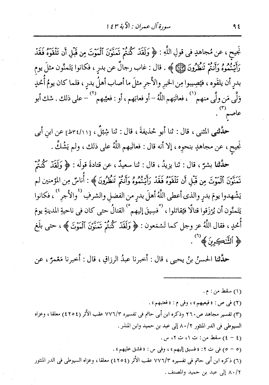 حَدَّثَنَا بِشْرٌ، قَالَ: ثنا يَزِيدُ، قَالَ: ثنا سَعِيدٌ، عَنْ قَتَادَةَ، قَوْلُهُ: {§وَلَقَدْ كُنْتُمْ تَمَنَّوْنَ الْمَوْتَ مِنْ قَبْلِ أَنْ تَلْقَوْهُ فَقَدْ رَأَيْتُمُوهُ وَأَنْتُمْ تَنْظُرُونَ} [آل عمران: 143] " أُنَاسٌ مِنَ الْمُؤْمِنِينَ لَمْ يَشْهَدُوا يَوْمَ بَدْرٍ وَالَّذِي أَعْطَى اللَّهُ أَهْلَ بَدْرٍ مِنَ الْفَضْلِ وَالشَّرَفِ وَالْأَجْرِ، فَكَانُوا يَتَمَنَّوْنَ أَنْ يُرْزَقُوا قِتَالًا فَيُقَاتِلُوا، فَسِيقَ إِلَيْهِمُ الْقِتَالُ حَتَّى كَانَ فِي نَاحِيَةِ الْمَدِينَةِ يَوْمَ أُحُدٍ، فَقَالَ اللَّهُ عَزَّ وَجَلَّ كَمَا تَسْمَعُونَ: {وَلَقَدْ كُنْتُمْ تَمَنَّوْنَ الْمَوْتَ} [آل عمران: 143] حَتَّى بَلَغَ: {الشَّاكِرِينَ} [آل عمران: 144] "