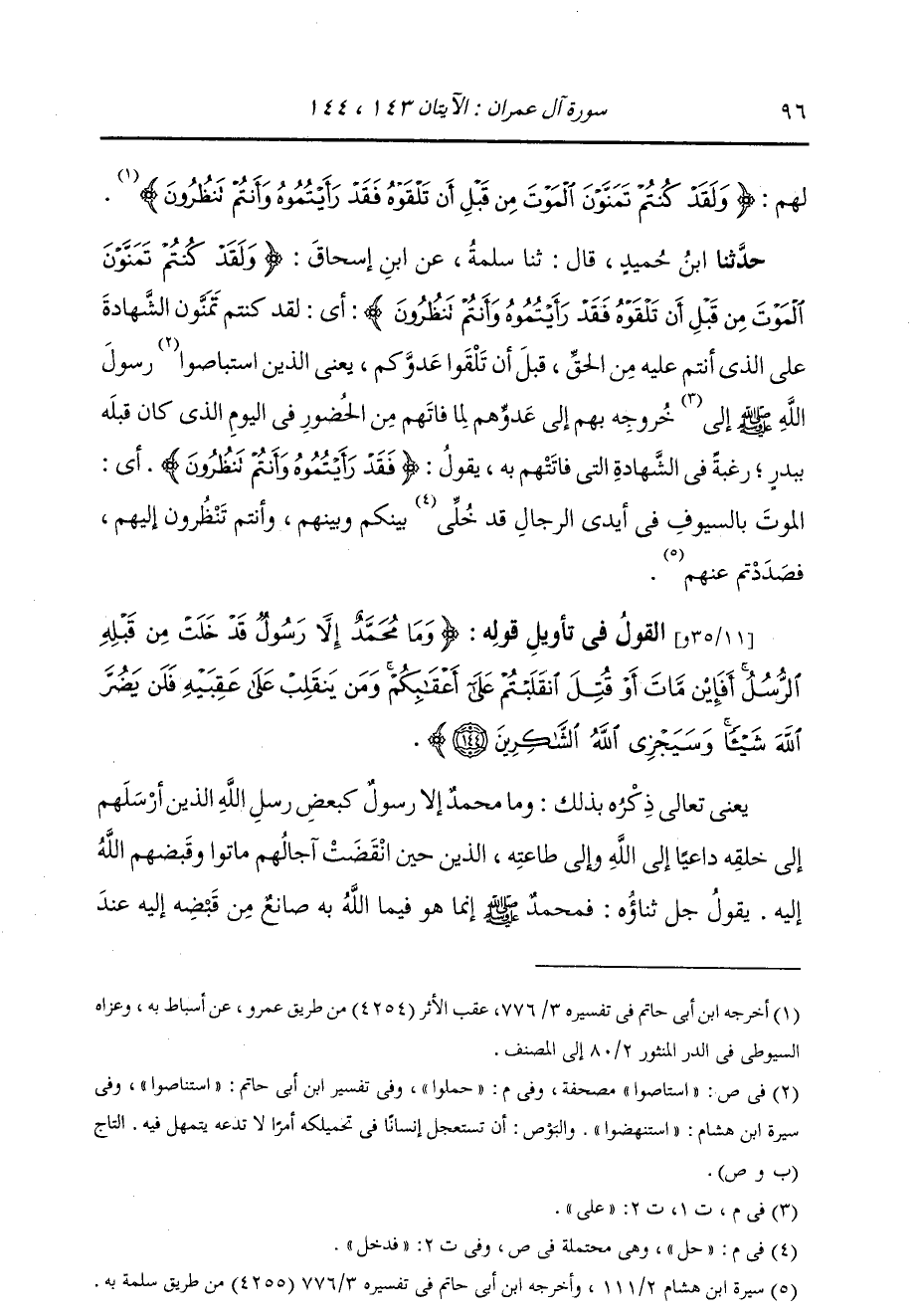 حَدَّثَنَا ابْنُ حُمَيْدٍ، قَالَ: ثنا سَلَمَةُ، عَنِ ابْنِ إِسْحَاقَ: {§وَلَقَدْ كُنْتُمْ تَمَنَّوْنَ الْمَوْتَ مِنْ قَبْلِ أَنْ تَلْقَوْهُ فَقَدْ رَأَيْتُمُوهُ وَأَنْتُمْ تَنْظُرُونَ} [آل عمران: 143] «أَيْ لَقَدْ كُنْتُمْ تَمَنَّوْنَ الشَّهَادَةَ عَلَى الَّذِي أَنْتُمْ عَلَيْهِ مِنَ الْحَقِّ قَبْلَ أَنْ تَلْقَوْا عَدُوَّكُمْ، يَعْنِي الَّذِينَ حَمَلُوا رَسُولَ اللَّهِ صَلَّى اللهُ عَلَيْهِ وَسَلَّمَ عَلَى خُرُوجِهِ بِهِمْ إِلَى عَدُوِّهِمْ لَمَّا فَاتَهُمْ مِنَ الْحُضُورِ فِي الْيَوْمِ الَّذِي كَانَ قَبْلَهُ بِبَدْرٍ؛ رَغْبَةً فِي الشَّهَادَةِ الَّتِي قَدْ فَاتَتْهُمْ بِهِ» يَقُولُ: {فَقَدْ رَأَيْتُمُوهُ وَأَنْتُمْ تَنْظُرُونَ} [آل عمران: 143] «أَيِ الْمَوْتَ بِالسُّيُوفِ فِي أَيْدِيِ الرِّجَالِ، قَدْ حَلَّ بَيْنَكُمْ وَبَيْنَهُمْ، وَأَنْتُمْ تَنْظُرُونَ إِلَيْهِمْ، فَصَدَدْتُمْ عَنْهُمْ»