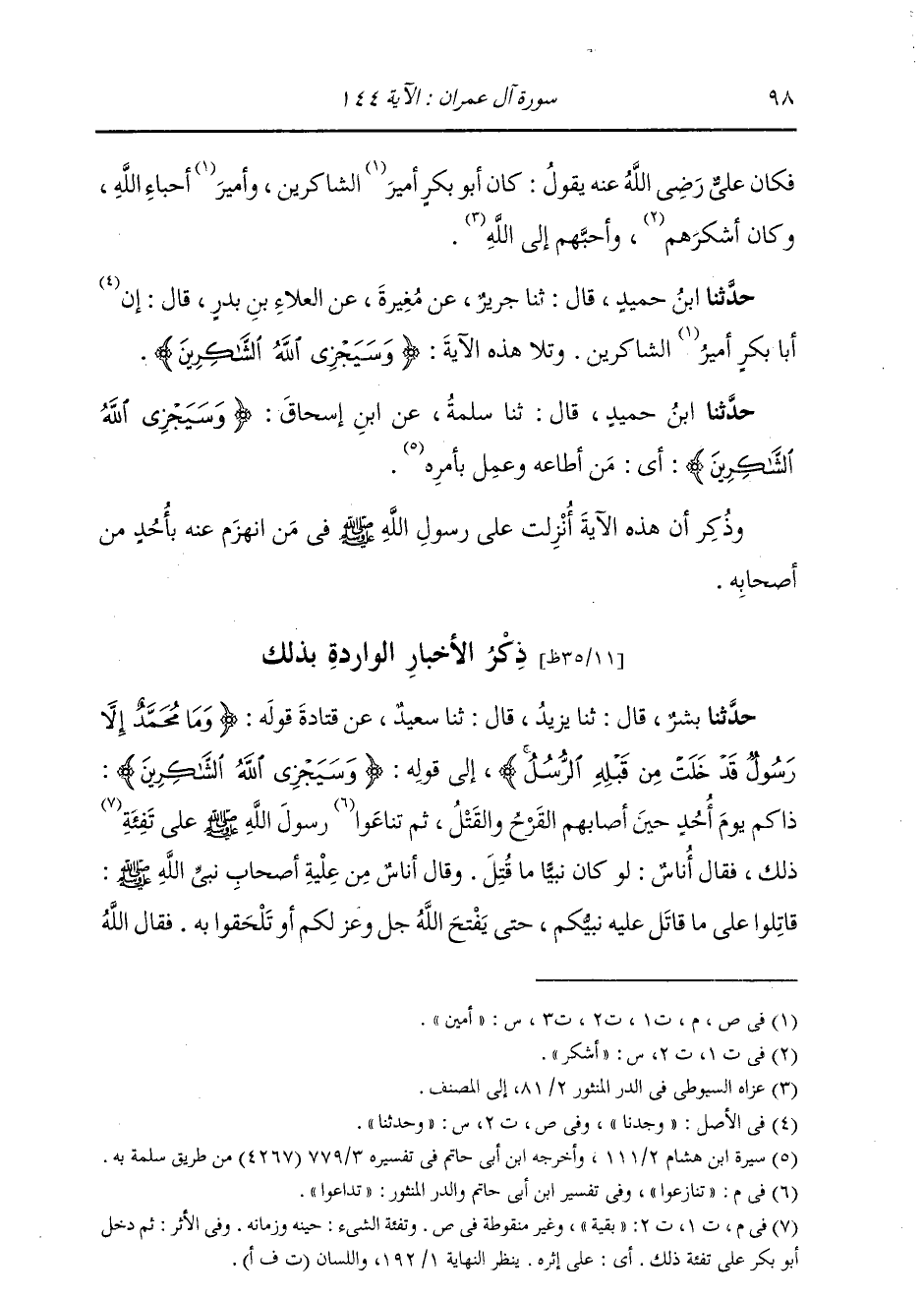حَدَّثَنَا ابْنُ حُمَيْدٍ، قَالَ: ثنا سَلَمَةُ، عَنِ ابْنِ إِسْحَاقَ: {§وَسَيَجْزِي اللَّهُ الشَّاكِرِينَ} [آل عمران: 144] «أَيْ مَنْ أَطَاعَهُ وَعَمِلَ بِأَمْرِهِ» وَذُكِرَ أَنَّ هَذِهِ الْآيَةَ أُنْزِلَتْ عَلَى رَسُولِ اللَّهِ صَلَّى اللهُ عَلَيْهِ وَسَلَّمَ فِيمَنِ انْهَزَمَ عَنْهُ بِأُحُدٍ مِنْ أَصْحَابِهِ