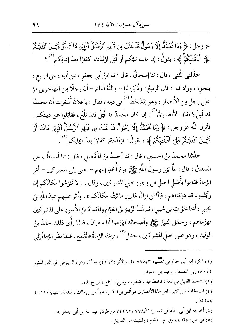 عَزَّ وَجَلَّ: {وَمَا مُحَمَّدٌ إِلَّا رَسُولٌ قَدْ خَلَتْ مِنْ قَبْلِهِ الرُّسُلُ أَفَإِنْ مَاتَ أَوْ قُتِلَ انْقَلَبْتُمْ عَلَى أَعْقَابِكُمْ} [آل عمران: 144] يَقُولُ: إِنْ مَاتَ نَبِيُّكُمْ، أَوْ قُتِلَ، ارْتَدَدْتُمْ كُفَّارًا بَعْدَ إِيمَانِكُمْ " حَدَّثَنِي الْمُثَنَّى، قَالَ: ثنا إِسْحَاقُ، قَالَ: ثنا ابْنُ أَبِي جَعْفَرٍ، عَنْ أَبِيهِ، عَنِ الرَّبِيعِ، بِنَحْوِهِ، وَزَادَ فِيهِ: قَالَ الرَّبِيعُ: وَذُكِرَ لَنَا وَاللَّهُ أَعْلَمُ أَنَّ رَجُلًا مِنَ الْمُهَاجِرِينَ مَرَّ عَلَى رَجُلٍ مِنَ الْأَنْصَارِ وَهُوَ يَتَشَحَّطُ فِي دَمِهِ، فَقَالَ: يَا فُلَانُ أَشَعُرْتَ أَنَّ مُحَمَّدًا " قَدْ قُتِلَ؟ فَقَالَ الْأَنْصَارِيُّ: إِنْ كَانَ مُحَمَّدٌ قَدْ قُتِلَ، فَقَدْ بَلَّغَ، فَقَاتِلُوا عَنْ دِينِكُمْ فَأَنْزَلَ اللَّهُ عَزَّ وَجَلَّ: {وَمَا مُحَمَّدٌ إِلَّا رَسُولٌ قَدْ خَلَتْ مِنْ قَبْلِهِ الرُّسُلُ أَفَإِنْ مَاتَ أَوْ قُتِلَ انْقَلَبْتُمْ عَلَى أَعْقَابِكُمْ} [آل عمران: 144] يَقُولُ: «ارْتَدَدْتُمْ كُفَّارًا بَعْدَ إِيمَانِكُمْ»