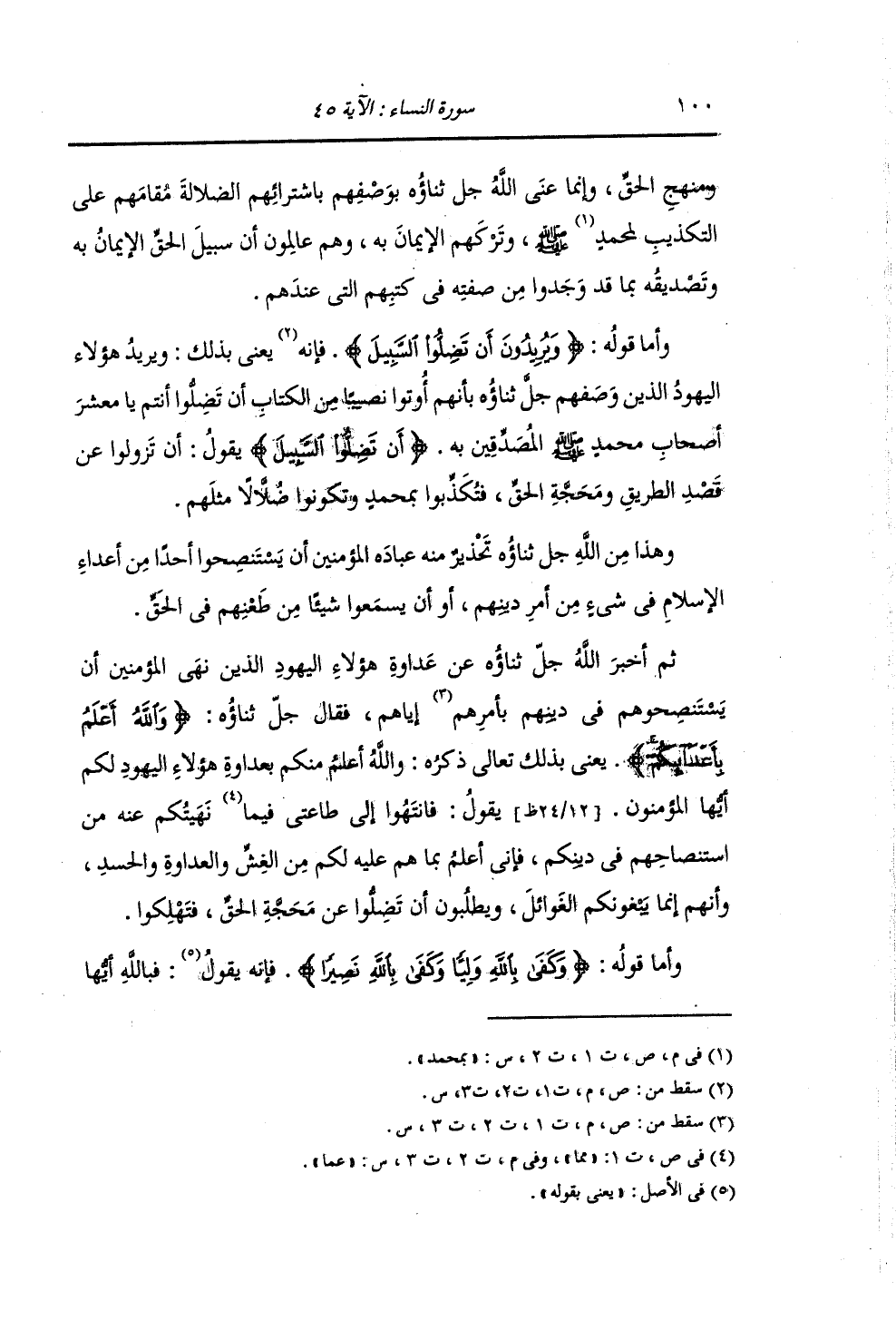 وَمَنْهَجِ الْحَقِّ. وَإِنَّمَا عَنَى اللَّهُ بِوَصْفِهِمْ بِاشْتِرَائِهِمُ الضَّلَالَةَ مَقَامَهُمْ عَلَى التَّكْذِيبِ بِمُحَمَّدٍ صَلَّى اللهُ عَلَيْهِ وَسَلَّمَ وَتَرْكَهُمُ الْإِيمَانَ بِهِ , وَهُمْ عَالِمُونَ أَنَّ السَّبِيلَ الْحَقَّ الْإِيمَانُ بِهِ وَتَصْدِيقَهُ بِمَا قَدْ وَجَدُوا مِنْ صِفَتِهِ فِي كُتُبِهِمُ الَّتِي عِنْدَهُمْ. وَأَمَّا قَوْلُهُ: {وَيُرِيدُونَ أَنْ تَضِلُّوا السَّبِيلَ} [النساء: 44] يَعْنِي بِذَلِكَ تَعَالَى ذِكْرُهُ: وَيُرِيدُ هَؤُلَاءِ الْيَهُودُ الَّذِينَ وَصَفَهُمُ جَلَّ ثَنَاؤُهُ بِأَنَّهُمْ أُوتُوا نَصِيبًا مِنَ الْكِتَابِ أَنْ تَضِلُّوا أَنْتُمْ يَا مَعْشَرَ أَصْحَابِ مُحَمَّدٍ صَلَّى اللهُ عَلَيْهِ وَسَلَّمَ الْمُصَدِّقِينَ بِهِ أَنْ تَضِلُّوا السَّبِيلَ , يَقُولُ: أَنْ تَزُولُوا عَنْ قَصْدِ الطَّرِيقِ , وَمَحَجَّةِ الْحَقِّ , فَتُكَذِّبُوا بِمُحَمَّدٍ , وَتَكُونُوا ضُلَّالًا مِثْلَهُمْ. وَهَذَا مِنَ اللَّهِ تَعَالَى ذِكْرُهُ تَحْذِيرٌ مِنْهُ عِبَادَهُ الْمُؤْمِنِينَ أَنْ يَسْتَنْصِحُوا أَحَدًا مِنْ أَعْدَاءِ الْإِسْلَامِ فِي شَيْءٍ مِنْ أَمْرِ دِينِهِمْ , أَوْ أَنْ يَسْمَعُوا شَيْئًا مِنْ طَعْنِهِمْ فِي الْحَقِّ. ثُمَّ أَخْبَرَ اللَّهُ جَلَّ ثَنَاؤُهُ عَنْ عَدَاوَةِ هَؤُلَاءِ الْيَهُودِ الَّذِينَ نَهَى الْمُؤْمِنِينَ أَنْ يَسْتَنْصِحُوهُمْ فِي دِينِهِمْ إِيَّاهُمْ , فَقَالَ جَلَّ ثَنَاؤُهُ: {وَاللَّهُ أَعْلَمُ بِأَعْدَائِكُمْ} [النساء: 45] يَعْنِي بِذَلِكَ تَعَالَى ذِكْرُهُ: وَاللَّهُ أَعْلَمُ مِنْكُمْ بِعَدَاوَةِ هَؤُلَاءِ الْيَهُودِ أَيُّهَا الْمُؤْمِنُونَ , يَقُولُ: فَانْتَهُوا إِلَى طَاعَتِي عَمَّا نَهَيْتُكُمْ عَنْهُ مِنِ اسْتِنْصَاحِهِمْ فِي دِينِكُمْ , فَإِنِّي أَعْلَمُ بِمَا هُمْ عَلَيْهِ لَكُمْ مِنَ الْغِشِّ وَالْعَدَاوَةِ وَالْحَسَدِ وَأَنَّهُمْ إِنَّمَا يَبْغُونَكُمُ الْغَوَائِلَ , وَيَطْلُبُونَ أَنْ تَضِلُّوا عَنْ مَحَجَّةِ الْحَقِّ فَتَهْلِكُوا. وَأَمَّا قَوْلُهُ: {وَكَفَى بِاللَّهِ وَلِيًّا وَكَفَى بِاللَّهِ نَصِيرًا} [النساء: 45] فَإِنَّهُ يَقُولُ: فَبِاللَّهِ