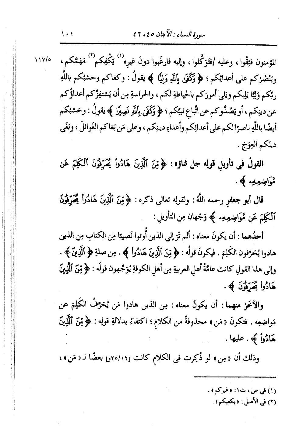 §الْقَوْلُ فِي تَأْوِيلِ قَوْلِهِ تَعَالَى: {مِنَ الَّذِينَ هَادُوا يُحَرِّفُونَ الْكَلِمَ عَنْ مَوَاضِعِهِ وَيَقُولُونَ سَمِعْنَا وَعَصَيْنَا وَاسْمَعْ غَيْرَ مُسْمَعٍ وَرَاعِنَا لَيًّا بِأَلْسِنَتِهِمْ وَطَعْنًا فِي الدِّينِ وَلَوْ أَنَّهُمْ قَالُوا سَمِعْنَا وَأَطَعْنَا وَاسْمَعْ وَانْظُرْنَا لَكَانَ خَيْرًا لَهُمْ وَأَقْوَمَ وَلَكِنْ لَعَنَهُمُ اللَّهُ بِكُفْرِهِمْ فَلَا يُؤْمِنُونُ إِلَّا قَلِيلًا} [النساء: 46] وَلِقَوْلِهِ جَلَّ ثَنَاؤُهُ: {مِنَ الَّذِينَ هَادُوا يُحَرِّفُونَ الْكَلِمَ} [النساء: 46] وَجْهَانِ مِنَ التَّأْوِيلِ: أَحَدُهُمَا: أَنْ يَكُونَ مَعْنَاهُ: أَلَمْ تَرَ إِلَى الَّذِينَ أُوتُوا نَصِيبًا مِنَ الْكِتَابِ مِنَ الَّذِينَ هَادُوا يُحَرِّفُونَ الْكَلِمَ فَيَكُونَ قَوْلُهُ: {مِنَ الَّذِينَ هَادُوا} [النساء: 46] مِنْ صِلَةِ الَّذِينَ. وَإِلَى هَذَا الْقَوْلِ كَانَتْ عَامَّةُ أَهْلِ الْعَرَبِيَّةِ مِنْ أَهْلِ الْكُوفَةِ يُوَجِّهُونَ. قَوْلَهُ: {مِنَ الَّذِينَ هَادُوا يُحَرِّفُونَ} [النساء: 46] وَالْآخَرُ مِنْهُمَا: أَنْ يَكُونَ مَعْنَاهُ: مِنَ الَّذِينَ هَادُوا مَنْ يُحَرِّفُ الْكَلِمَ عَنْ مَوَاضِعِهِ. فَتَكُونَ مِنْ مَحْذُوفَةً مِنَ الْكَلَامِ اكْتِفَاءً بِدَلَالَةِ قَوْلِهِ: {مِنَ الَّذِينَ هَادُوا} [النساء: 46] عَلَيْهَا , وَذَلِكَ أَنَّ مِنْ لَوْ ذُكِرَتْ فِي الْكَلَامِ كَانَتْ بَعْضًا لِمِنْ ,