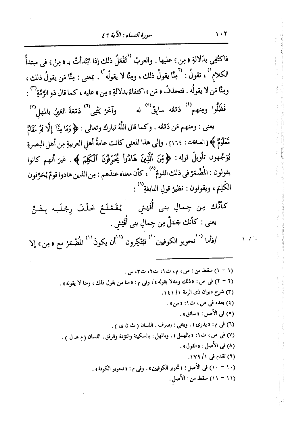 يَعْنِي: كَأَنَّكَ جَمَلٌ مِنْ جِمَالِ أُقَيْشٍ فَأَمَّا نَحْوِيُّو الْكُوفَةِ , فَيُنْكِرُونَ أَنْ يَكُونَ الْمُضْمَرُ مَعَ مِنْ