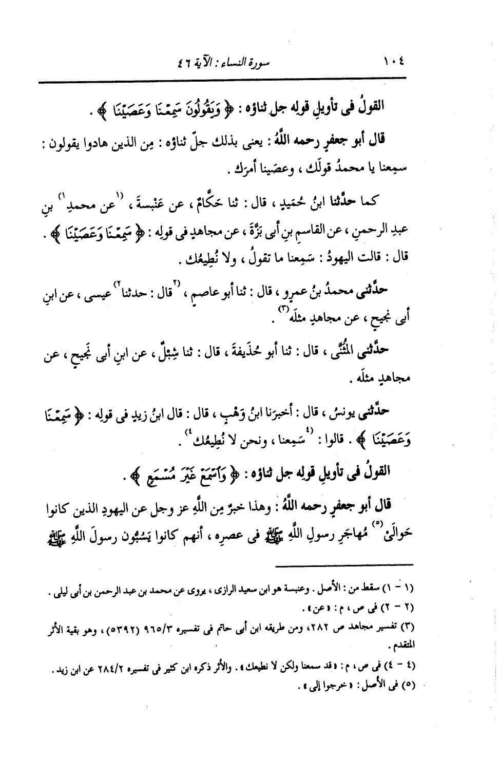 حَدَّثَنَا ابْنُ حُمَيْدٍ , قَالَ: ثنا حَكَّامٌ , عَنْ عَنبَسَةَ , عَنْ مُحَمَّدِ بْنِ عَبْدِ الرَّحْمَنِ , عَنِ الْقَاسِمِ بْنِ أَبِي بَزَّةَ , عَنْ مُجَاهِدٍ , فِي قَوْلِهِ: {§سَمِعْنَا وَعَصَيْنَا} [النساء: 46] قَالَ: " قَالَتِ الْيَهُودُ: سَمِعْنَا مَا , تَقُولُ , وَلَا نُطِيعُكَ " حَدَّثَنِي مُحَمَّدُ بْنُ عَمْرٍو , قَالَ: ثنا أَبُو عَاصِمٍ , عَنْ عِيسَى , عَنِ ابْنِ أَبِي نَجِيحٍ , عَنْ مُجَاهِدٍ , مِثْلَهُ حَدَّثَنِي الْمُثَنَّى , قَالَ: ثنا أَبُو حُذَيْفَةَ , قَالَ: ثنا شِبْلٌ , عَنِ ابْنِ أَبِي نَجِيحٍ , عَنْ مُجَاهِدٍ , مِثْلَهُ
