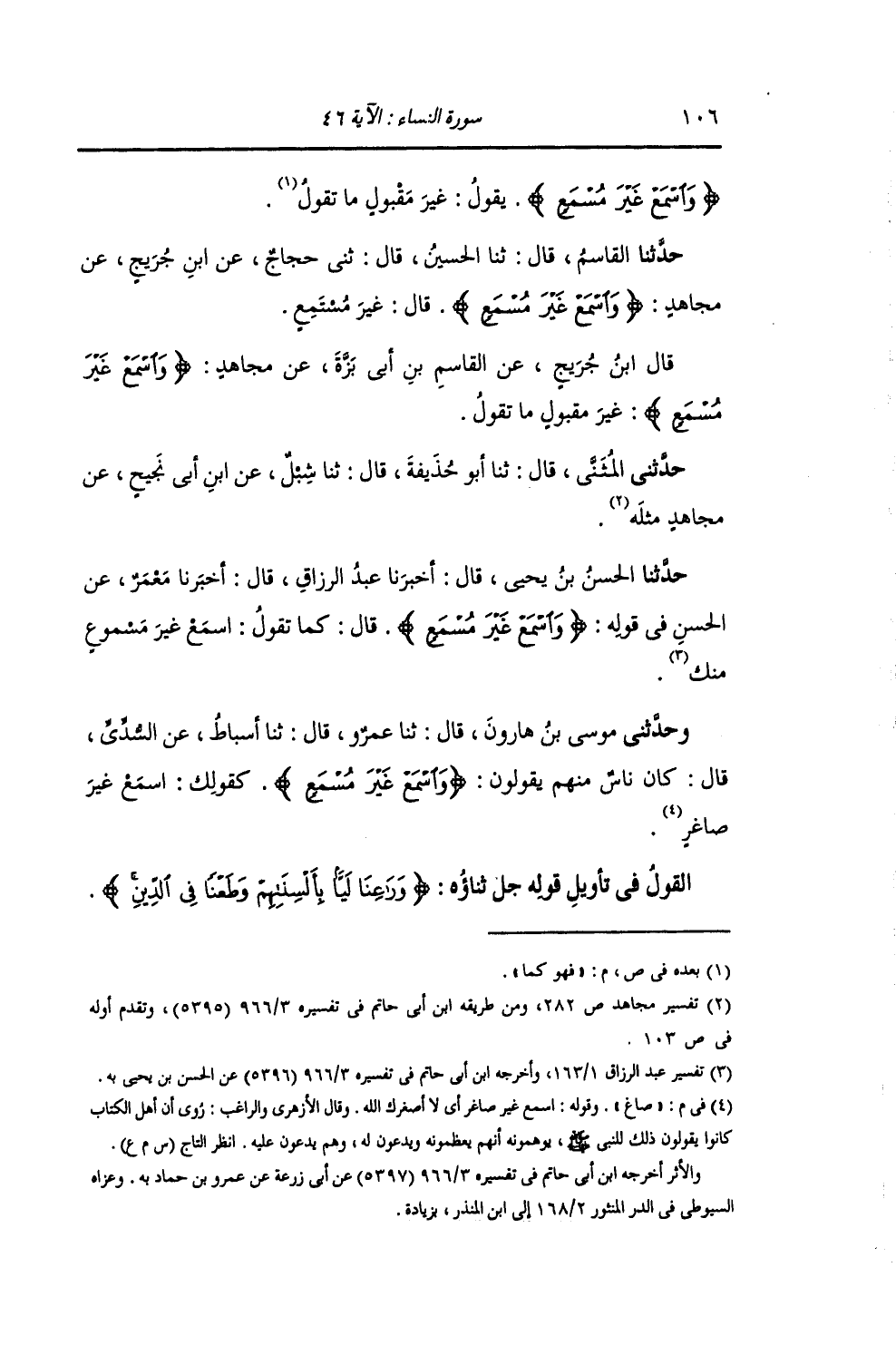 §الْقَوْلُ فِي تَأْوِيلِ قَوْلِهِ تَعَالَى: {وَرَاعِنَا لَيًّا بِأَلْسِنَتِهِمْ وَطَعْنًا فِي الدِّينِ} [النساء: 46]-[107]- يَعْنِي بِقَوْلِهِ: {وَرَاعِنَا} [النساء: 46] أَيْ رَاعِنَا سَمْعَكَ , افْهَمْ عَنَّا وَأَفْهِمْنَا. وَقَدْ بَيَّنَّا تَأْوِيلَ ذَلِكَ فِي سُورَةِ الْبَقَرَةِ بِأَدِلَّتِهِ بِمَا فِيهِ الْكِفَايَةُ عَنْ إِعَادَتِهِ. ثُمَّ أَخْبَرَ اللَّهُ جَلَّ ثَنَاؤُهُ عَنْهُمْ أَنَّهُمْ يَقُولُونَ ذَلِكَ لِرَسُولِ اللَّهِ صَلَّى اللهُ عَلَيْهِ وَسَلَّمَ: {لَيًّا بِأَلْسِنَتِهِمْ} [النساء: 46] يَعْنِي: تَحْرِيكًا مِنْهُمْ بِأَلْسِنَتِهِمْ بِتَحْرِيفٍ مِنْهُمْ لِمَعْنَاهُ إِلَى الْمَكْرُوهِ مِنْ مَعْنَيَيْهِ , وَاسْتِخْفَافًا مِنْهُمْ بِحَقِّ النَّبِيِّ صَلَّى اللهُ عَلَيْهِ وَسَلَّمَ {وَطَعْنًا فِي الدِّينِ} [النساء: 46] كَمَا: