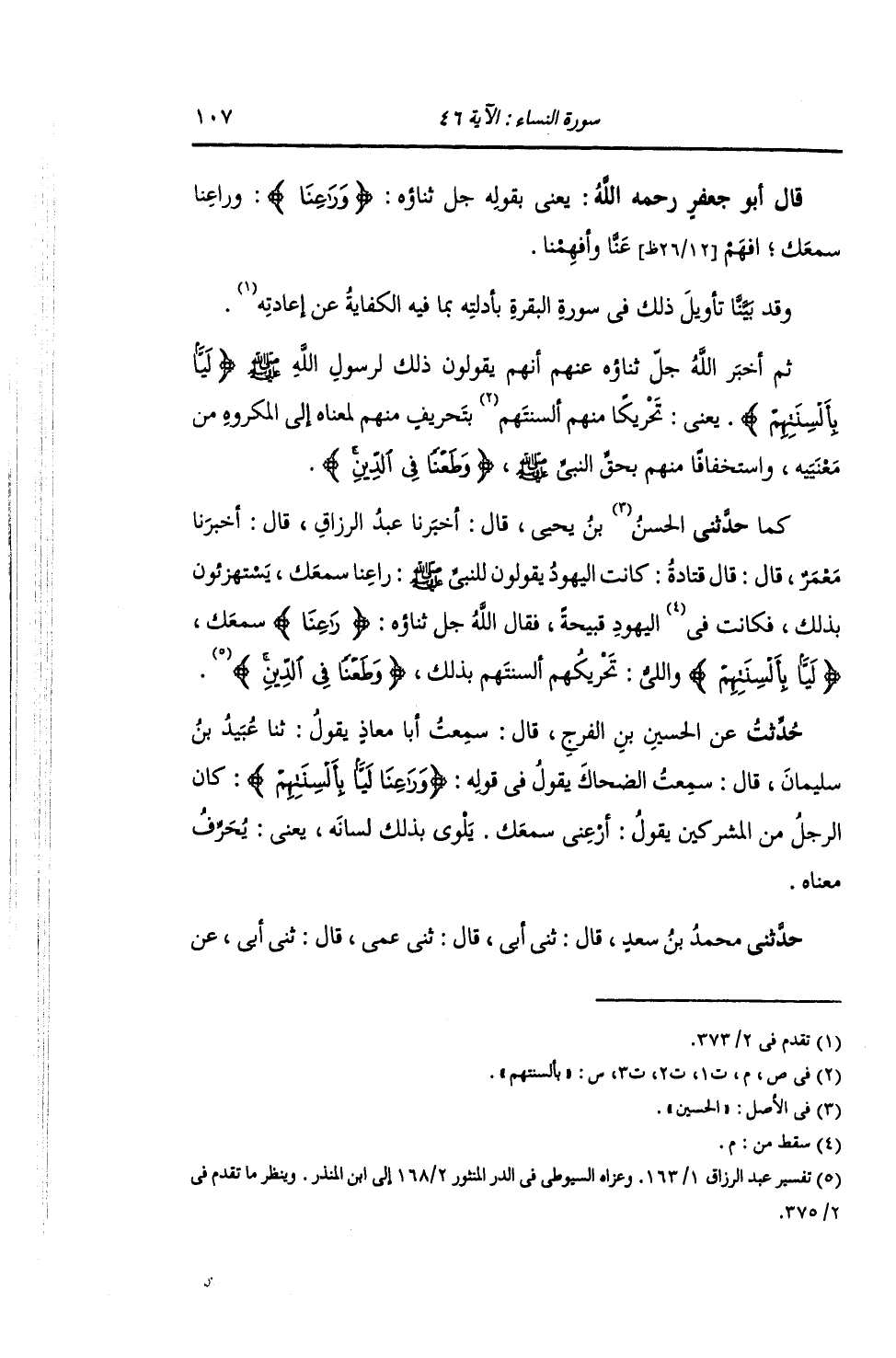 حَدَّثَنِي الْحَسَنُ بْنُ يَحْيَى , قَالَ: أَخْبَرَنَا عَبْدُ الرَّزَّاقِ , قَالَ: أَخْبَرَنَا مَعْمَرٌ , قَالَ: قَالَ قَتَادَةُ: كَانَتِ الْيَهُودُ يَقُولُونَ لِلنَّبِيِّ صَلَّى اللهُ عَلَيْهِ وَسَلَّمَ: §رَاعِنَا سَمْعَكَ. يسْتَهْزِئُونَ بِذَلِكَ , فَكَانَتِ الْيَهُودُ قَبِيحَةً , فَقَالَ: رَاعِنَا سَمْعَكَ لَيًّا بِأَلْسِنَتِهِمْ؛ وَاللَّيُّ: تَحْرِيكُهُمْ أَلْسِنَتَهُمْ بِذَلِكَ {وَطَعْنًا فِي الدِّينِ} [النساء: 46] "