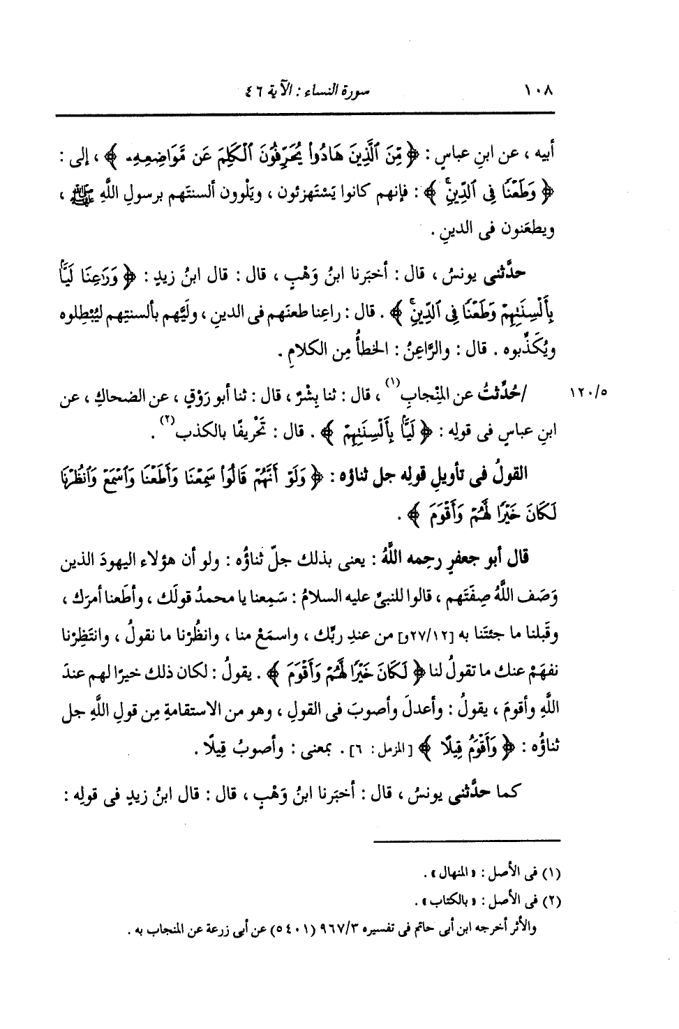 حُدِّثْتُ عَنِ الْمِنْجَابِ , قَالَ: ثنا بِشْرٌ , ثنا: أَبُو رَوْقٍ , عَنِ الضَّحَّاكِ , عَنِ ابْنِ عَبَّاسٍ , فِي قَوْلِهِ: {§لَيًّا بِأَلْسِنَتِهِمْ} [النساء: 46] قَالَ: «تَحْرِيفًا بِالْكَذِبِ»