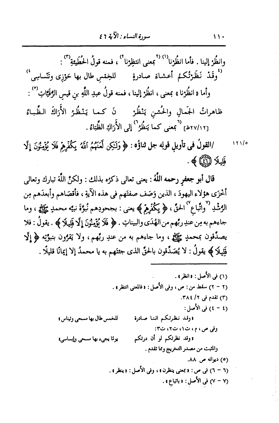 §الْقَوْلُ فِي تَأْوِيلِ قَوْلِهِ تَعَالَى: {وَلَكِنْ لَعَنَهُمُ اللَّهُ بِكُفْرِهِمْ فَلَا يُؤْمِنُونَ إِلَّا قَلِيلَا} [النساء: 46] يَعْنِي بِذَلِكَ: وَلَكِنَّ اللَّهَ تَبَارَكَ وَتَعَالَى أَخْزَى هَؤُلَاءِ الْيَهُودَ الَّذِينَ وَصَفَ صِفَتَهُمْ فِي هَذِهِ الْآيَةِ فَأَقْصَاهُمْ وَأَبْعَدَهُمْ مِنَ الرُّشْدِ , وَاتِّبَاعِ الْحَقِّ بِكُفْرِهِمْ , يَعْنِي بِجُحُودِهِمْ نُبُوَّةَ نَبِيِّهِ مُحَمَّدٍ صَلَّى اللهُ عَلَيْهِ وَسَلَّمَ , وَمَا جَاءَهُمْ بِهِ مِنْ عِنْدِ رَبِّهِمْ مِنَ الْهُدَى وَالْبَيِّنَاتِ {فَلَا يُؤْمِنُونَ إِلَّا قَلِيلًا} [النساء: 46] يَقُولُ: " فَلَا يُصَدِّقُونَ بِمُحَمَّدٍ صَلَّى اللهُ عَلَيْهِ وَسَلَّمَ , وَمَا جَاءَهُمْ بِهِ مِنْ عِنْدِ رَبِّهِمْ , وَلَا يُقِرُّونَ بِنُبُوَّتِهِ إِلَّا قَلِيلًا , يَقُولُ: لَا يُصَدِّقُونَ بِالْحَقِّ الَّذِي جِئْتَهُمْ بِهِ يَا مُحَمَّدُ إِلَّا إِيمَانًا قَلِيلًا. -[111]- كَمَا: