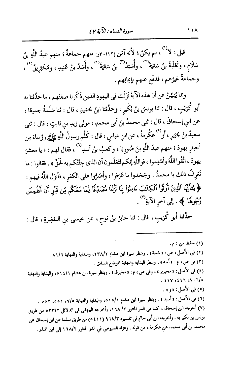 حَدَّثَنَا أَبُو كُرَيْبٍ , قَالَ: ثنا يُونُسُ بْنُ بُكَيْرٍ , وَحَدَّثَنَا ابْنُ حُمَيْدٍ , قَالَ: ثنا سَلَمَةُ , جَمِيعًا , عَنِ ابْنِ إِسْحَاقَ , قَالَ: ثني مُحَمَّدُ بْنُ أَبِي مُحَمَّدٍ مَوْلَى زَيْدِ بْنِ ثَابِتٍ قَالَ: ثني سَعِيدُ بْنُ جُبَيْرٍ أَوْ عِكْرِمَةُ , عَنِ ابْنِ عَبَّاسٍ , قَالَ: كَلَّمَ رَسُولُ اللَّهِ صَلَّى اللهُ عَلَيْهِ وَسَلَّمَ رُؤَسَاءُ مِنْ أَحْبَارِ يَهُودَ , مِنْهُمْ عَبْدُ اللَّهِ بْنُ صُورِيَا وَكَعْبُ بْنُ أَسَدٍ فَقَالَ لَهُمْ: «يَا مَعْشَرَ يَهُودَ , اتَّقُوا اللَّهَ وَأَسْلِمُوا فَوَاللَّهِ إِنَّكُمْ لَتَعْلَمُونَ أَنَّ الَّذِيَ جِئْتُكُمْ بِهِ لَحَقٌّ» فَقَالُوا: مَا نَعْرِفُ ذَلِكَ يَا مُحَمَّدُ , وَجَحَدُوا مَا عَرَفُوا , وَأَصَرُّوا عَلَى الْكُفْرِ. فَأَنْزَلَ اللَّهُ فِيهِمْ: {§يَا أَيُّهَا الَّذِينَ أُوتُوا الْكِتَابَ آمِنُوا بِمَا نَزَّلْنَا مُصَدِّقًا لِمَا مَعَكُمْ مِنْ قَبْلِ أَنْ نَطْمِسَ وُجُوهًا فَنَرُدَّهَا عَلَى أَدْبَارِهَا} [النساء: 47] الْآيَةُ "